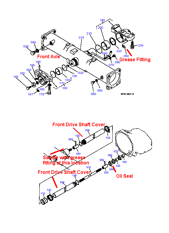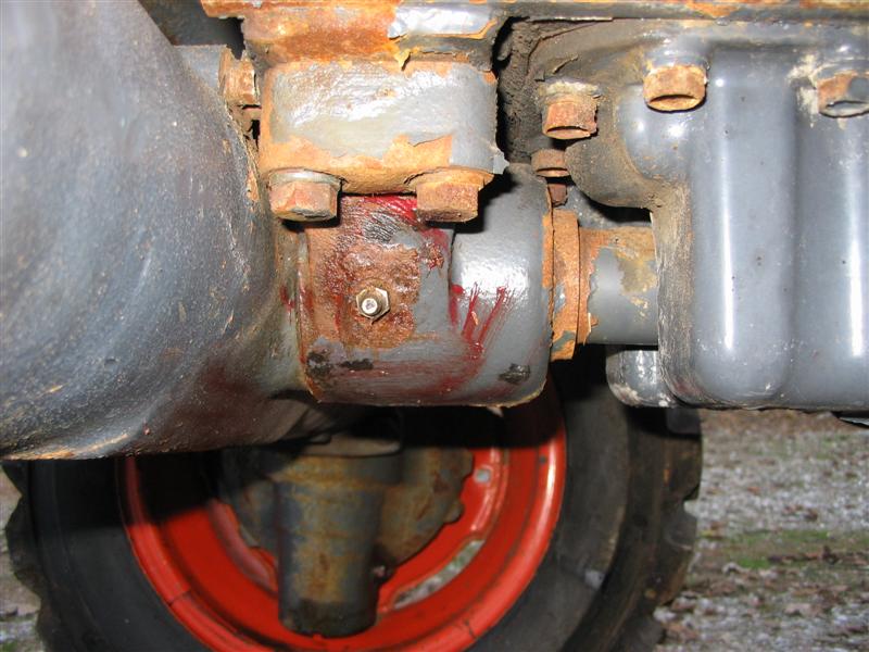 Here is a picture of the grease zirk behind the front axle on my L35 that I overgreased (ALLOT). I figure the grease traveled down the front driveline tube, through a low pressure oil seal (as was mentioned) and right into my hydraulic system. AAAAAARRRRRRRGGGGGGGHHHHHHHH!!!!!!!!!