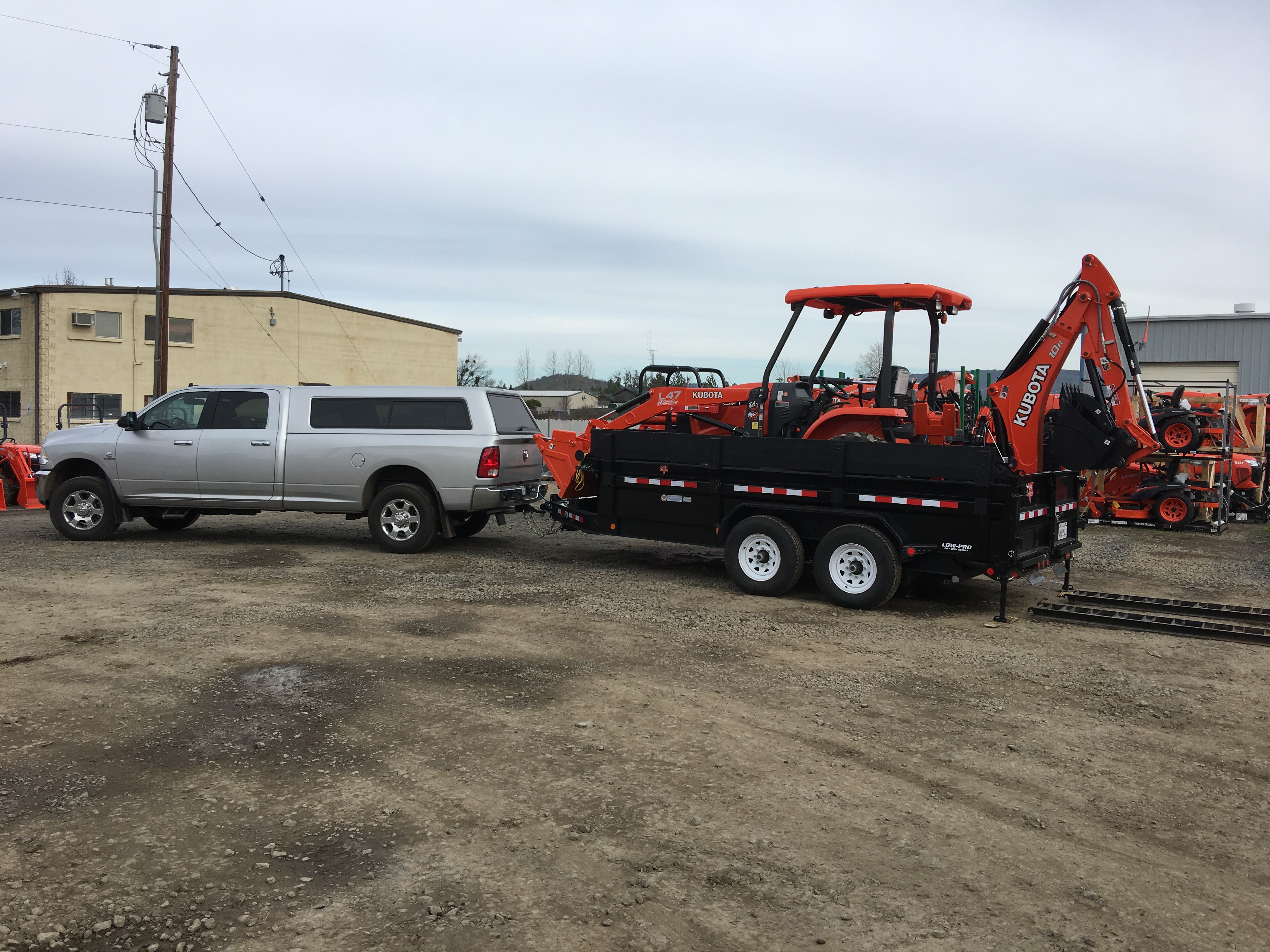 I have to agree with all the comments the Mike made regarding weight. I don't think you appreciate you rear biased the weight of an L45 is with the hoe on it. The hoe is ~1,500 pounds but that weight is centered at least two feet behind the rear axle. This counter balances most if not all of the weight of the portion of the front end loader and bucket which extends beyond the front axle. I have 900 pounds of foam in the four tires on my L45 in addition to the additional weight of the cab which is at least an additional 500 pounds I believe with the heat and A/C. The disadvantage to my deck over dump trailer is that it sits higher so I had eight foot ramps made to get the L45 in it rather than the six foot ones I used with my previous 14' dump trailer. When I drive up the ramps with nothing on the FEL to pick up my 4-in-1 bucket, I have to be very careful on the accelerator as there is almost no weight on the front axle and the L45 will do a wheelie very easily. As I mentioned in one of my previous posts, when driving or backing the L45 into a trailer I always put it in low range (turtle mode) as if it auto downshifts as you are going up a ramp the machine can unexpected suddenly move very fast. You will find that going up a steep hill with an empty front bucket the L45 is very light at the front end. Rather than calculating static weights I would definitely get you truck and trailer weighed before and after loading to be safe.