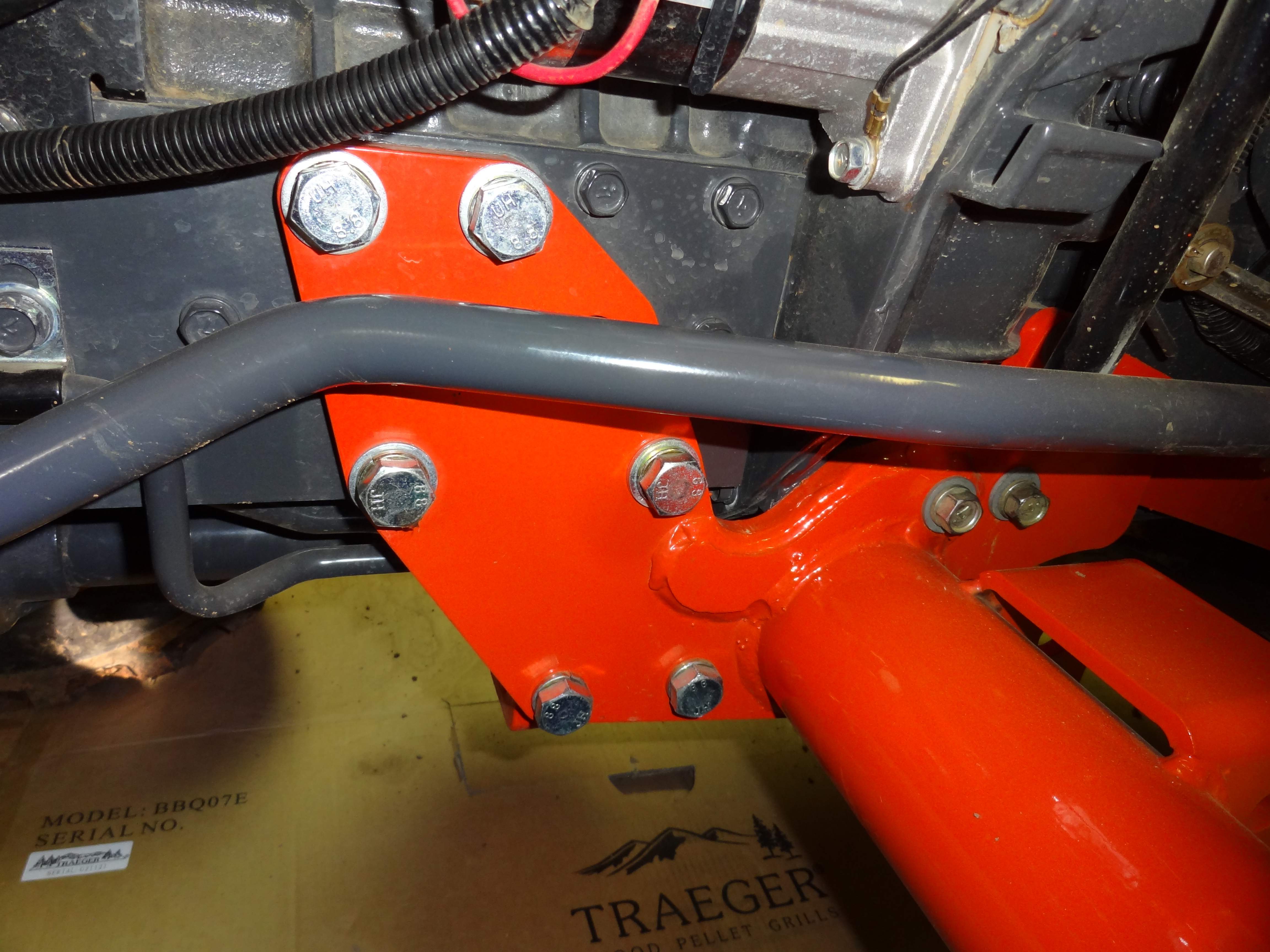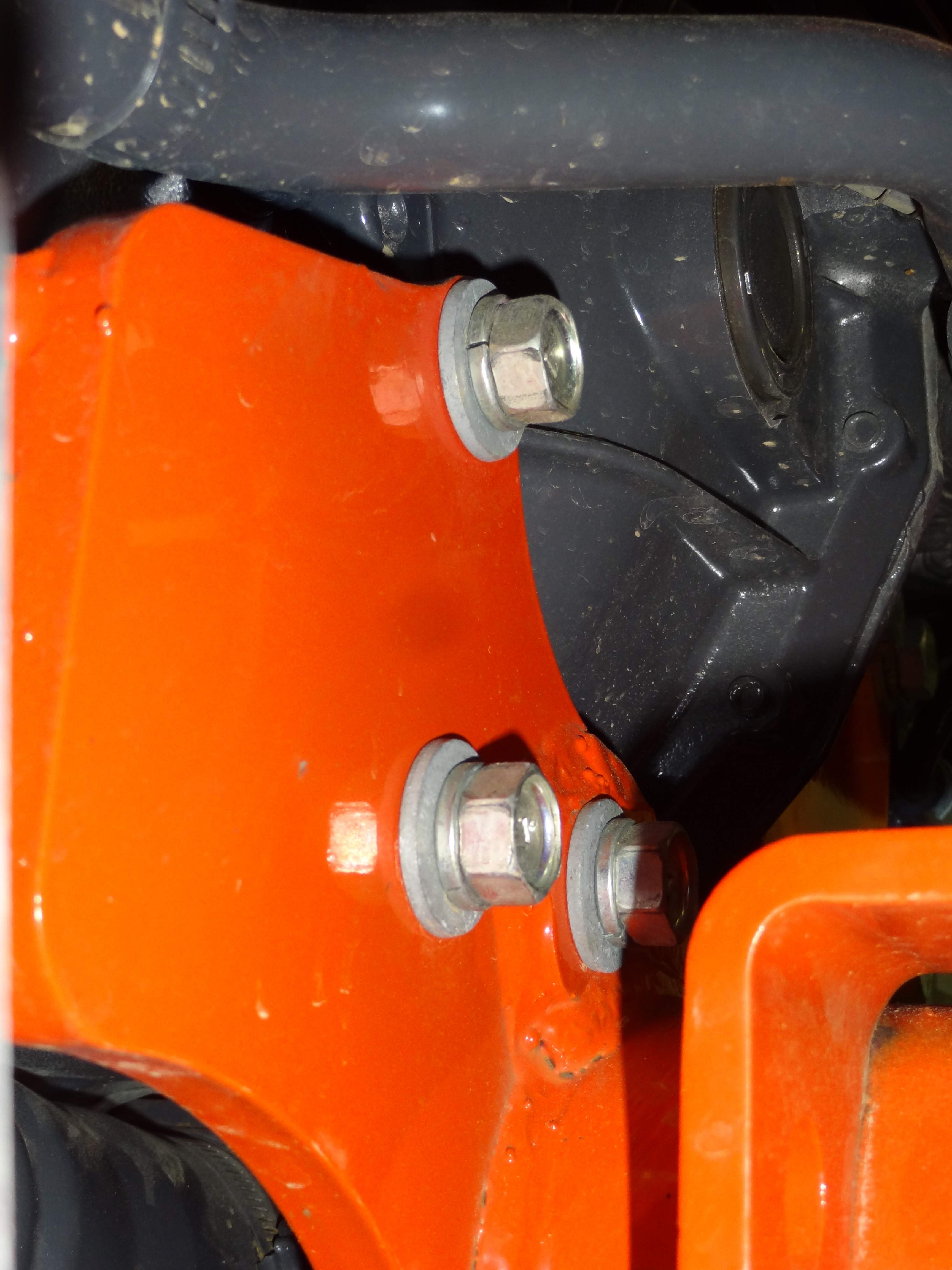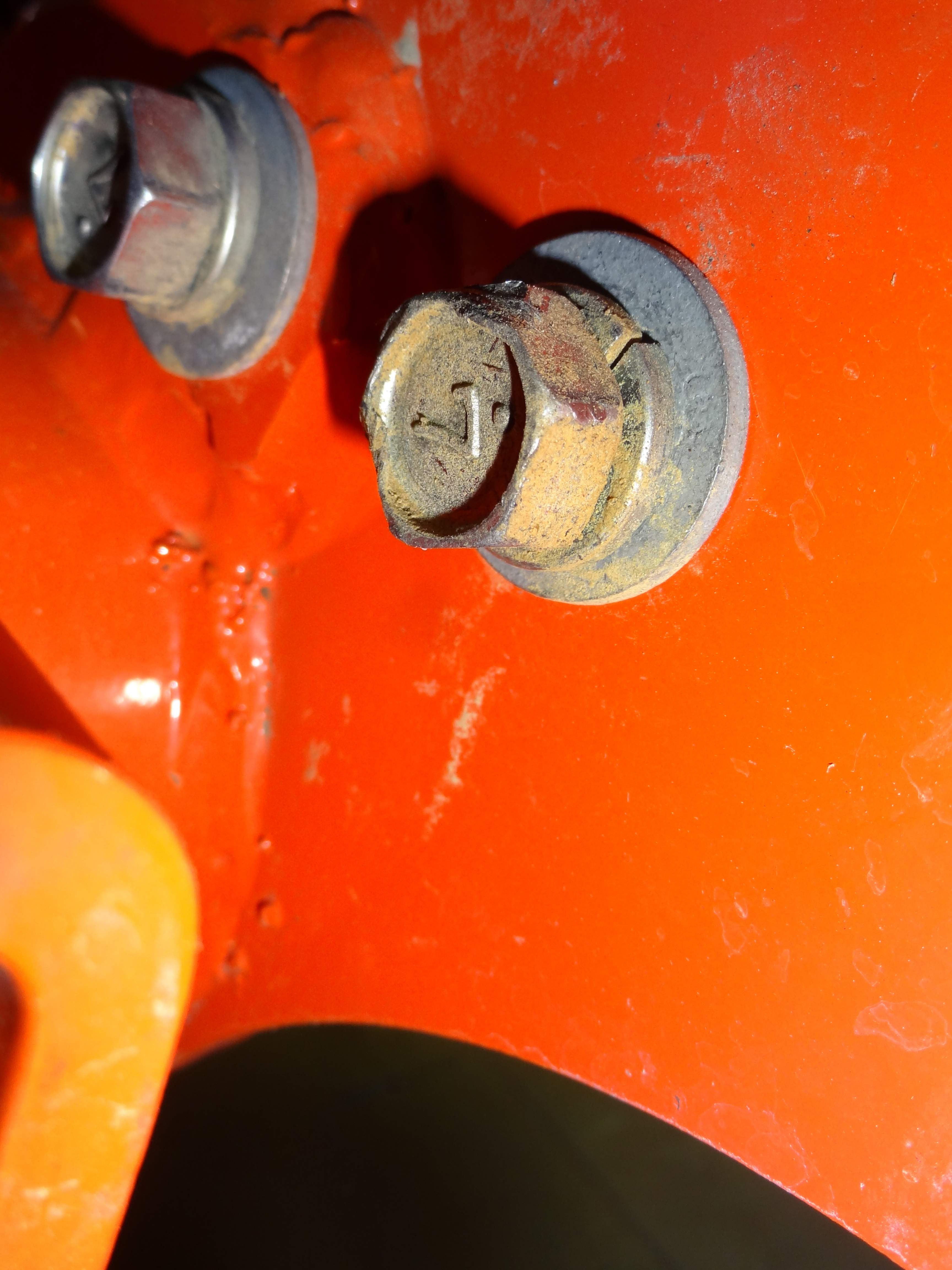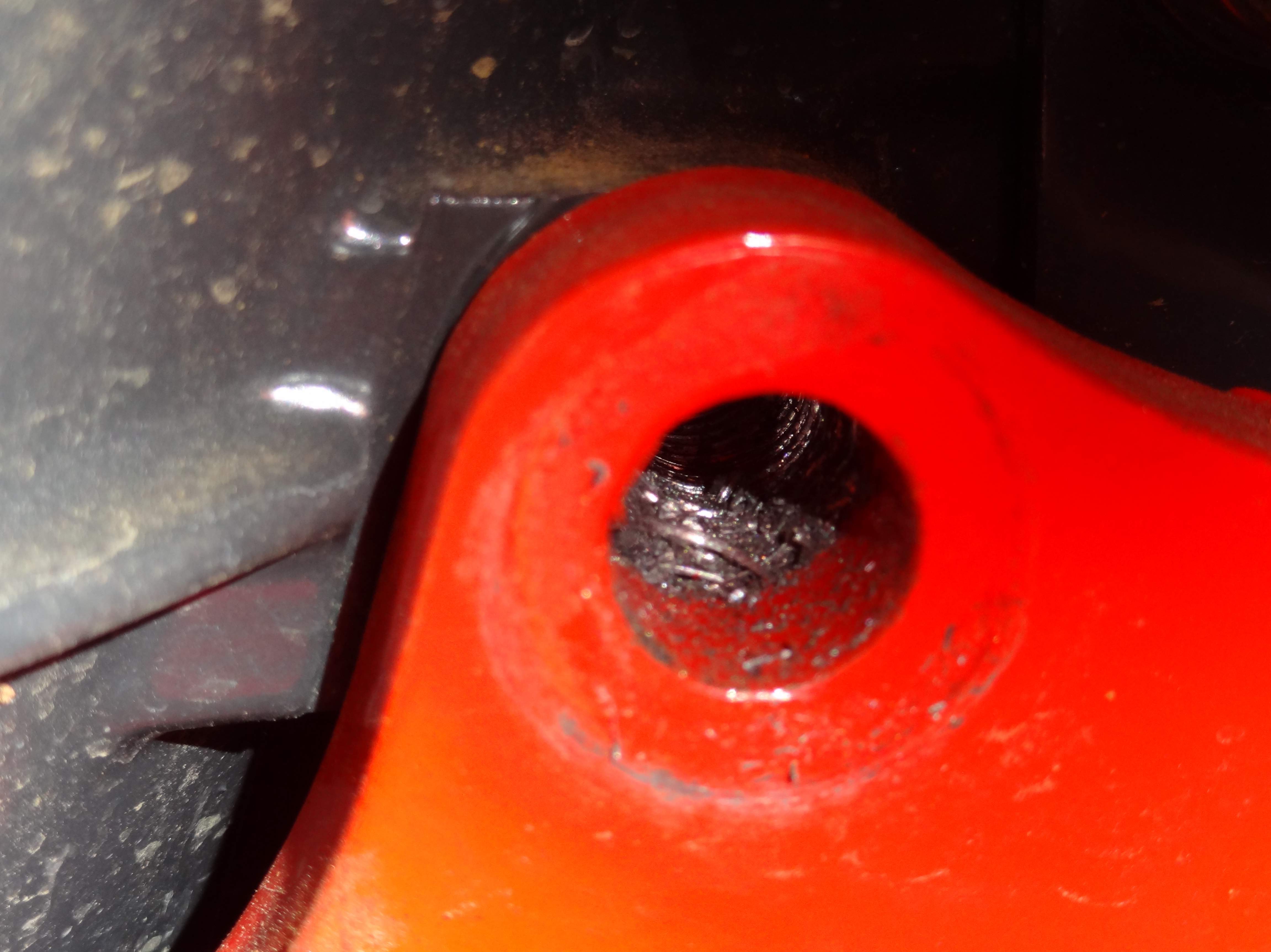 The bolt on the left of the tractor is crossed and more than likely done with and impact at the dealer. I could see the front of the hole is damaged but the thread looked good deeper in the hole :( Im going to try and find a tap and perhaps some new bolts if needed. I hope only the one bolt is crossed I havent checked the rest yet. the side that is high is the right side and thats the side that is high when the loader is on as well. I feel rather sure that the out of level is just a result of the sub frame being loose. and shifted. When I first put my rachet on the bolt i was amazed how loose it was!!! then to find all 6 I couldnt belive it!! The front bolts which are 18 or 19mm were tighter still not as tight as i would have expected though..