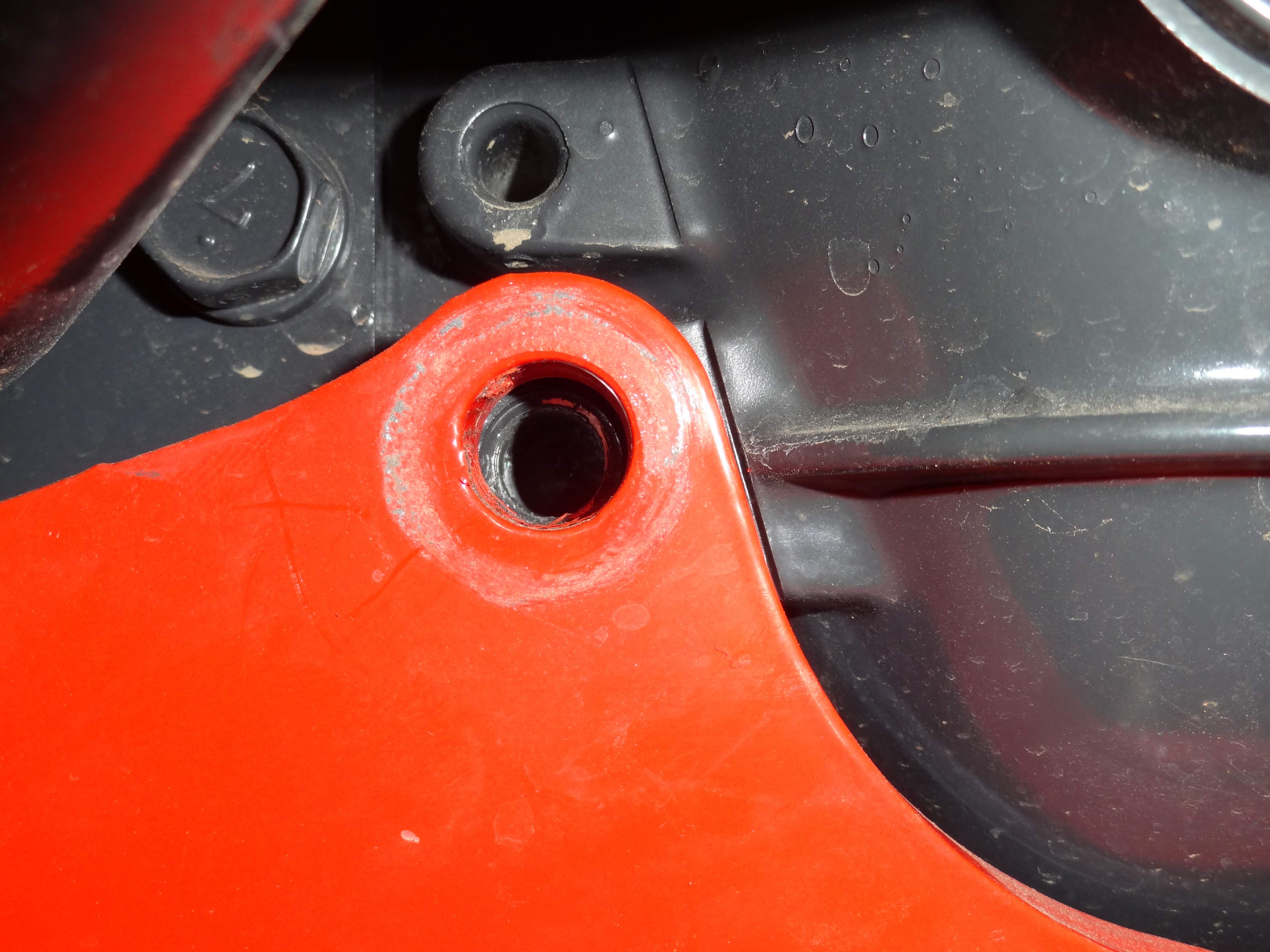 the pic where the bolt is removed and all the metal shavings are is the left side of the tractor. the side that is lower than the right.