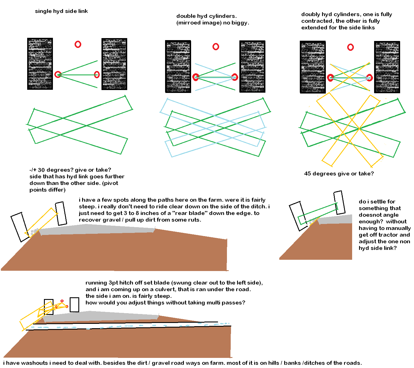 --hand controls for 3pt hitch and any remotes even factor remotes do not lend themselves good for a single hand, and being able to operate them at the same time. if i had 2 hyd side links, i could almost guarantee the levers would be side by side, and i could tap them slightly like i would with 2 levers of a FEL (front end loader) to adjust tilt in either direction (a finger on each lever) and in this... could feather in either direciton. with and/without dealing raising / lowering 3pt hitch. Other words. it would be like. having a FEL, were each arm raised and lower independently of each other. how many times you wish you could of done that while back dragging with the FEL?
