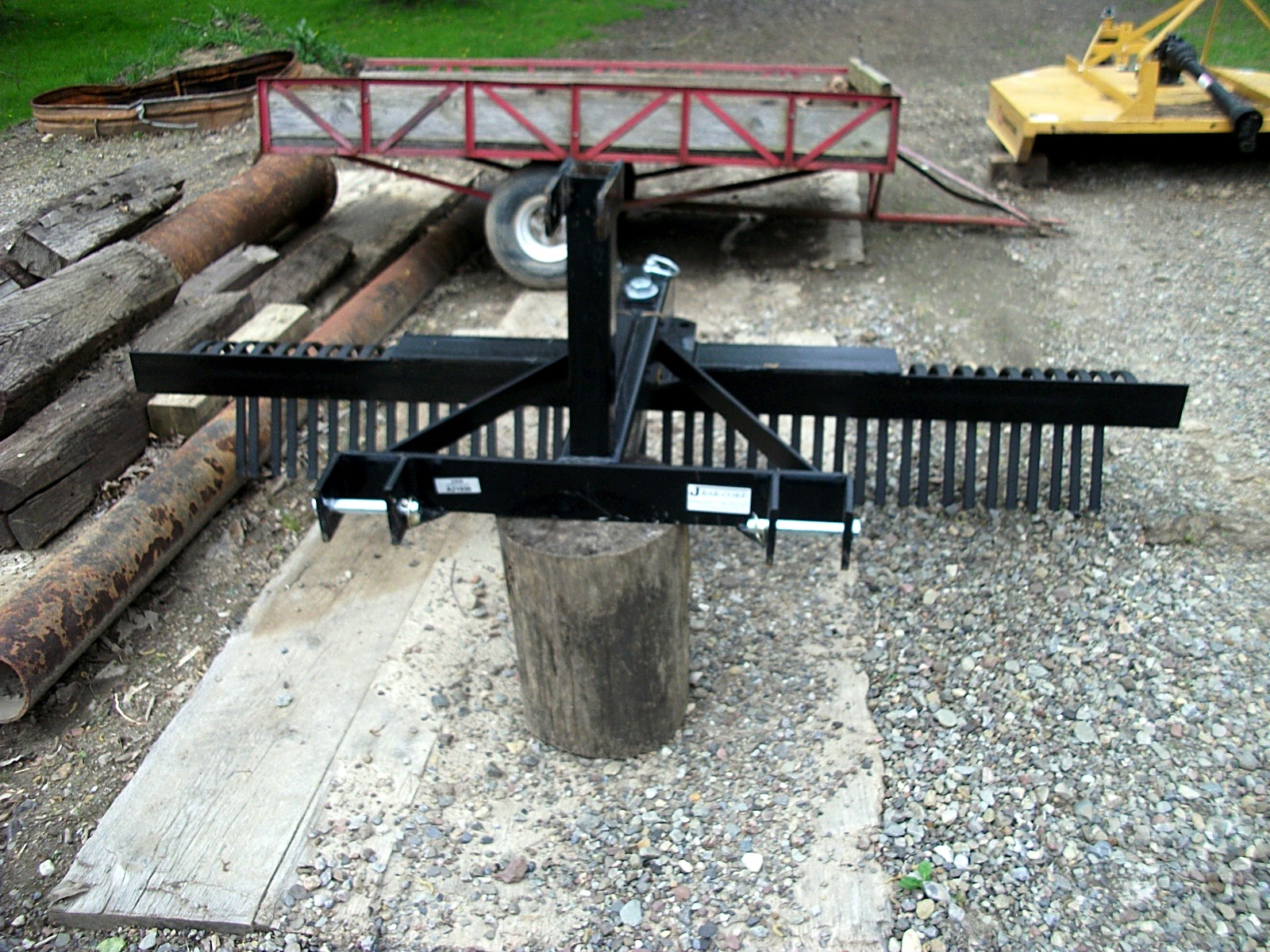 I know it says JBar Corp on it, but..I can't find one like it in any photos..The story is, that I had a 72" County Line Box blade and landscape rake. I have a NH Boomer 41. The box blade was junk. It did not have clevis style hitch pin attach, and the bolts to the top link arms and pins would never stay tight. I ended up bending the hitch up. I took it to a guy who beefed it up good. Also the sandwich style channel iron they use in the rakes is terrible. Hit a root or rock and it bends..after a few more bending actions it gets weak. Poor design and too big a tractor. Anyway, after I got the box blade reinforced it was great..But I had already purchased a Woods box blade that is much heavier and all around better. I figured to sell the CL box on Craigslist. The guy wanted my CL rake also. I sold them both to him. While I was in his area, I found a new rake for sale....It has clevis hitch and seem pretty well built...see pics...anyway I looked up Jbar mfg and they have all kinds of attachments and trailers, brush hogs, tillers, etc The rakes on there site look lighter....I was wondering if somehow someone bought the rake section from them and mfg'd a heavier hitch.. what does anyone think...I have yet to use this thing, as its too dam wet around here still. If the welding is good, it looks much better than that junk CL rake...Best thing is that was CHEAP in price. I looked at quite a few rakes and this one seems as good as some of the bigger names product.