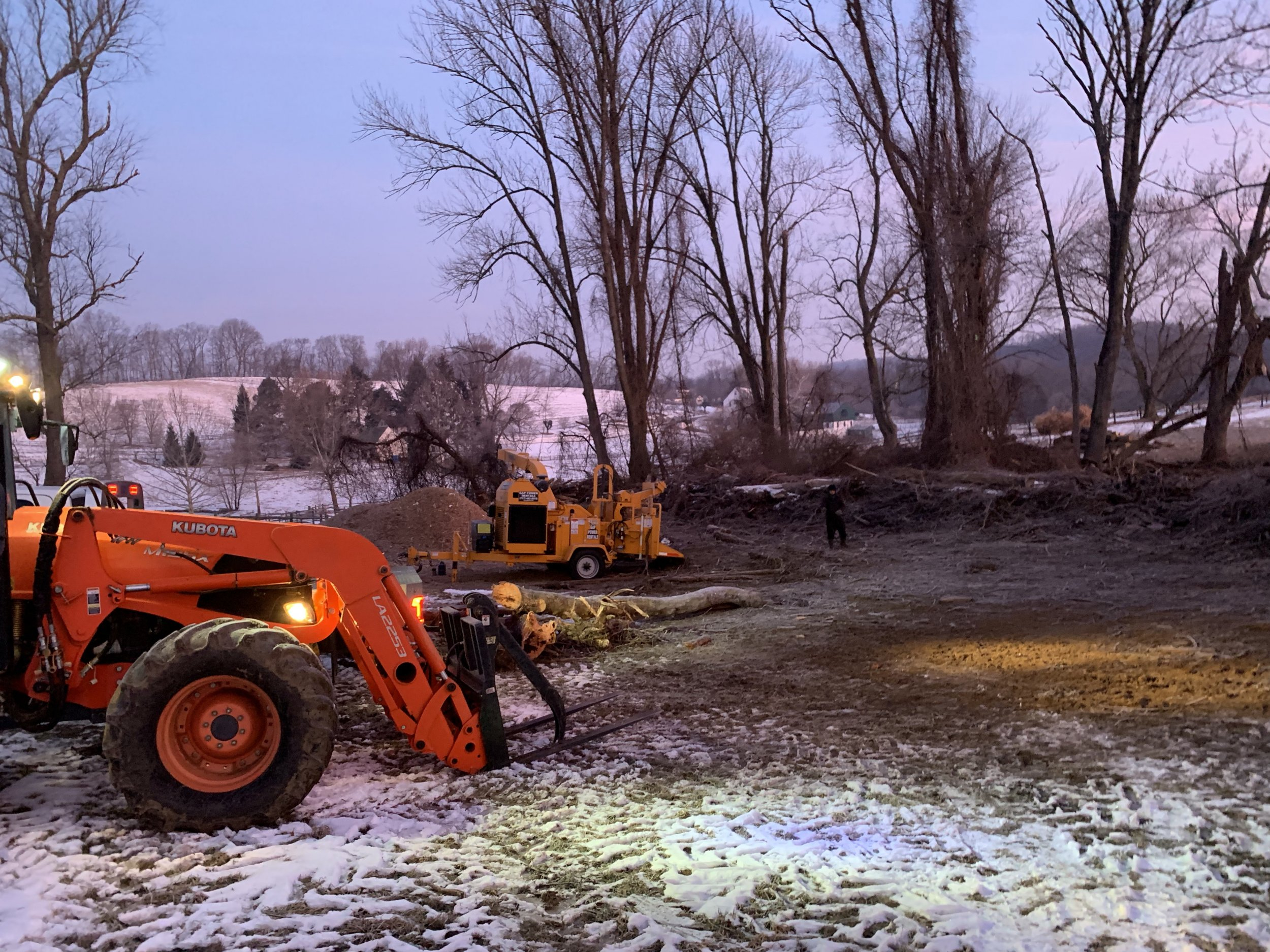 I was approached by a new hay farming customer about doing some winter work. Clearing thousands of branches cleared from around hay field by previous farmer and trees he cut down. They were all hauled to one central pile-probably 10 years worth. Roughly measured about 175’ long by 50’ wide and 6-8’ high. Heres a view of it at about 7 am 16 degrees out. My Ram and a rental Brush Bandit 18x chipper on the other side of the pile.