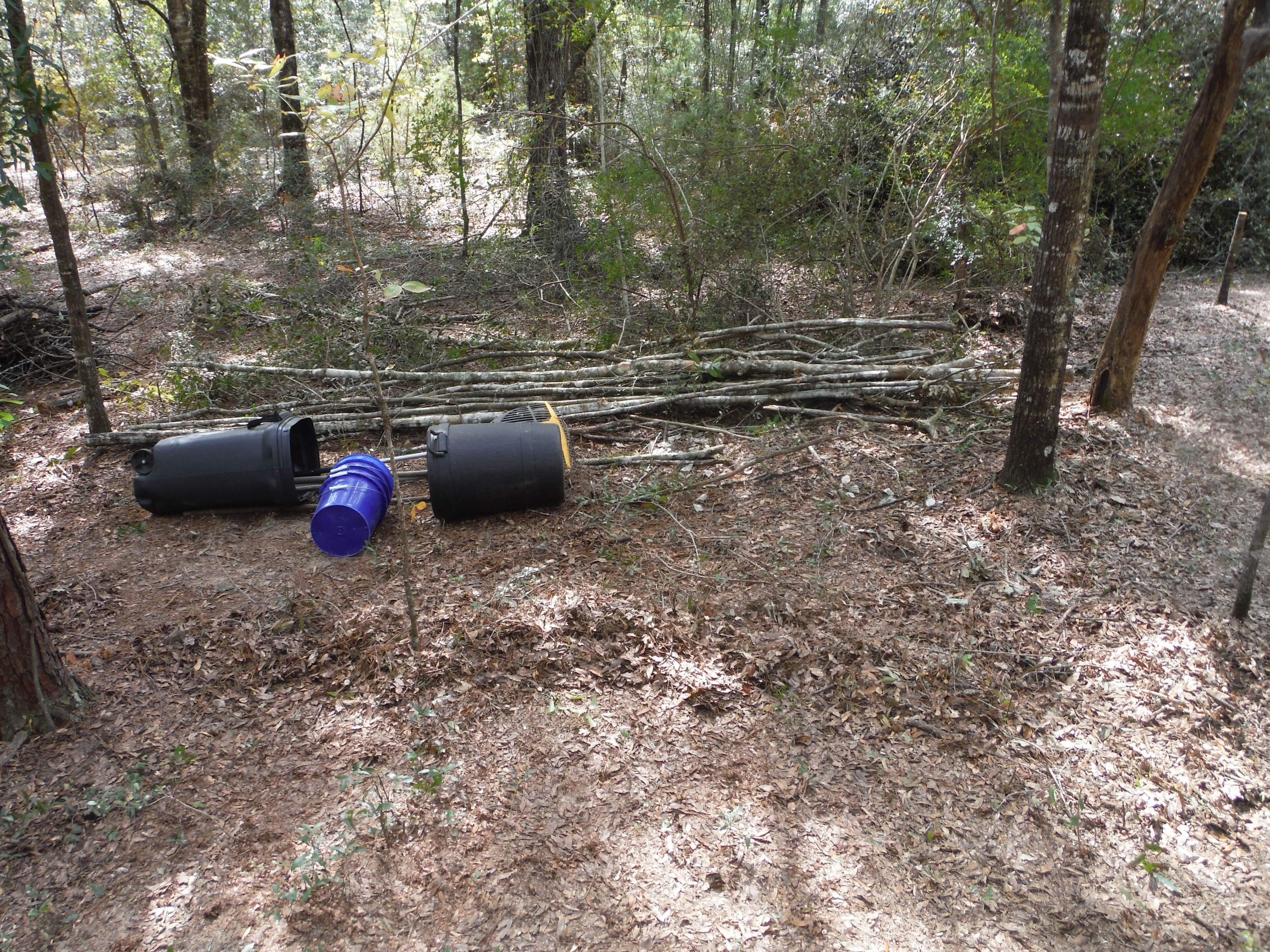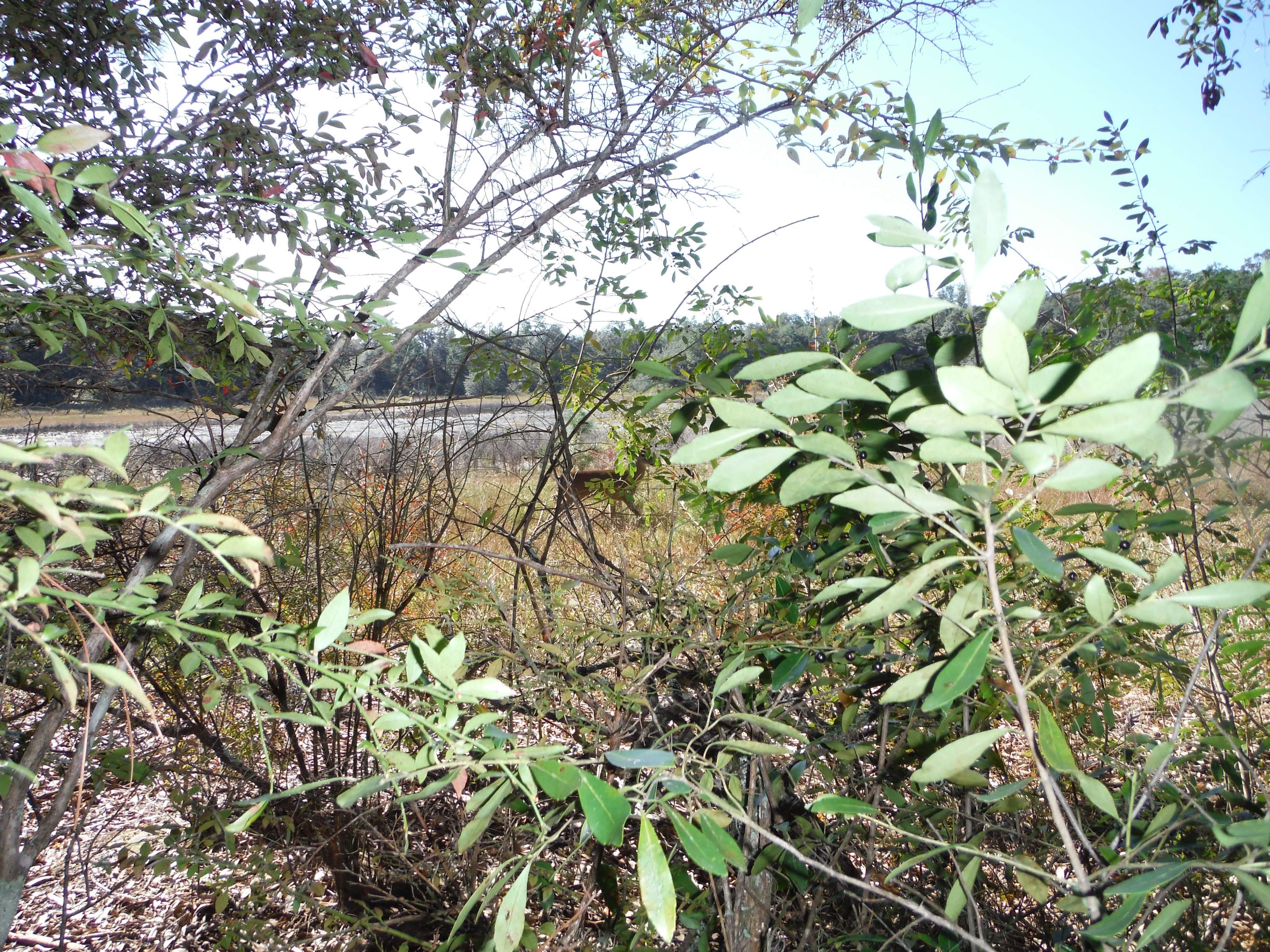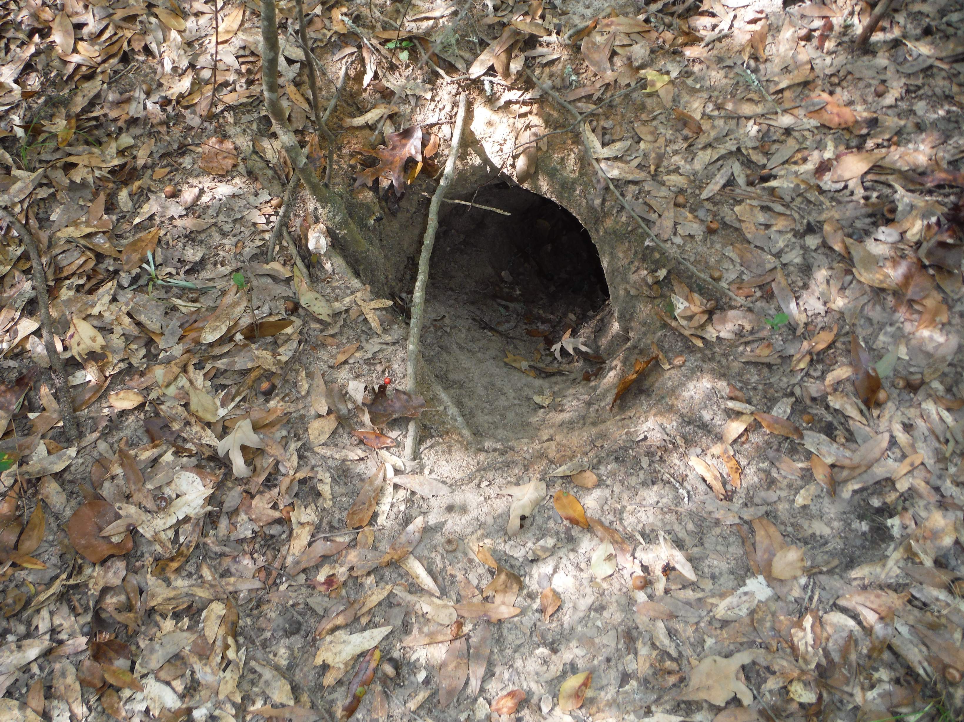 I had decided on a tent camping spot, dug a fire pit and started bringing in my pots and pans. I'm thinking of camping later this week, so I was figuring out the best way to hang a tarp when two deer ran through the camp. Another one stayed on the pond side, and I was able to get a picture of her. I'm wanting to hunt those deer later, so I thought it was best to move my camp off their trail. When I was looking for a better site, I came across the abode of another of my underground neighbors. This one looks like it is used for sure.
