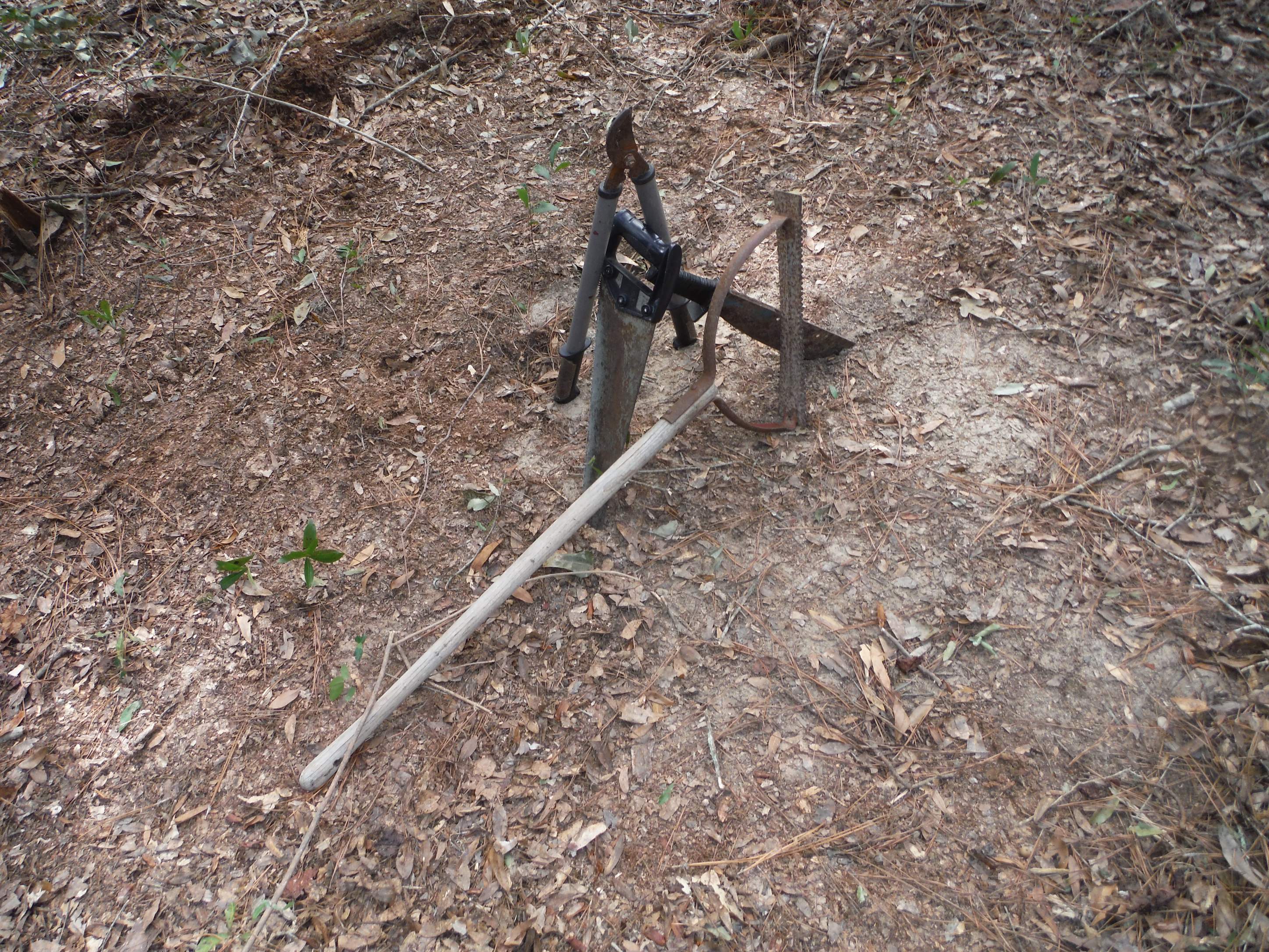 I spent the first night at my new camp last night. After much walking and looking, I put the camp where my outside kitchen is going to go. I had to move my pole pile, then clean up some of the brush. I did most of that with the machete, saw and loppers. {I seem to have misplaced my nippers} But on the smaller stuff I did get the chance to use my old swing blade. And if nothing else, it gave me an excuse to say, "I like them French fried potaters."