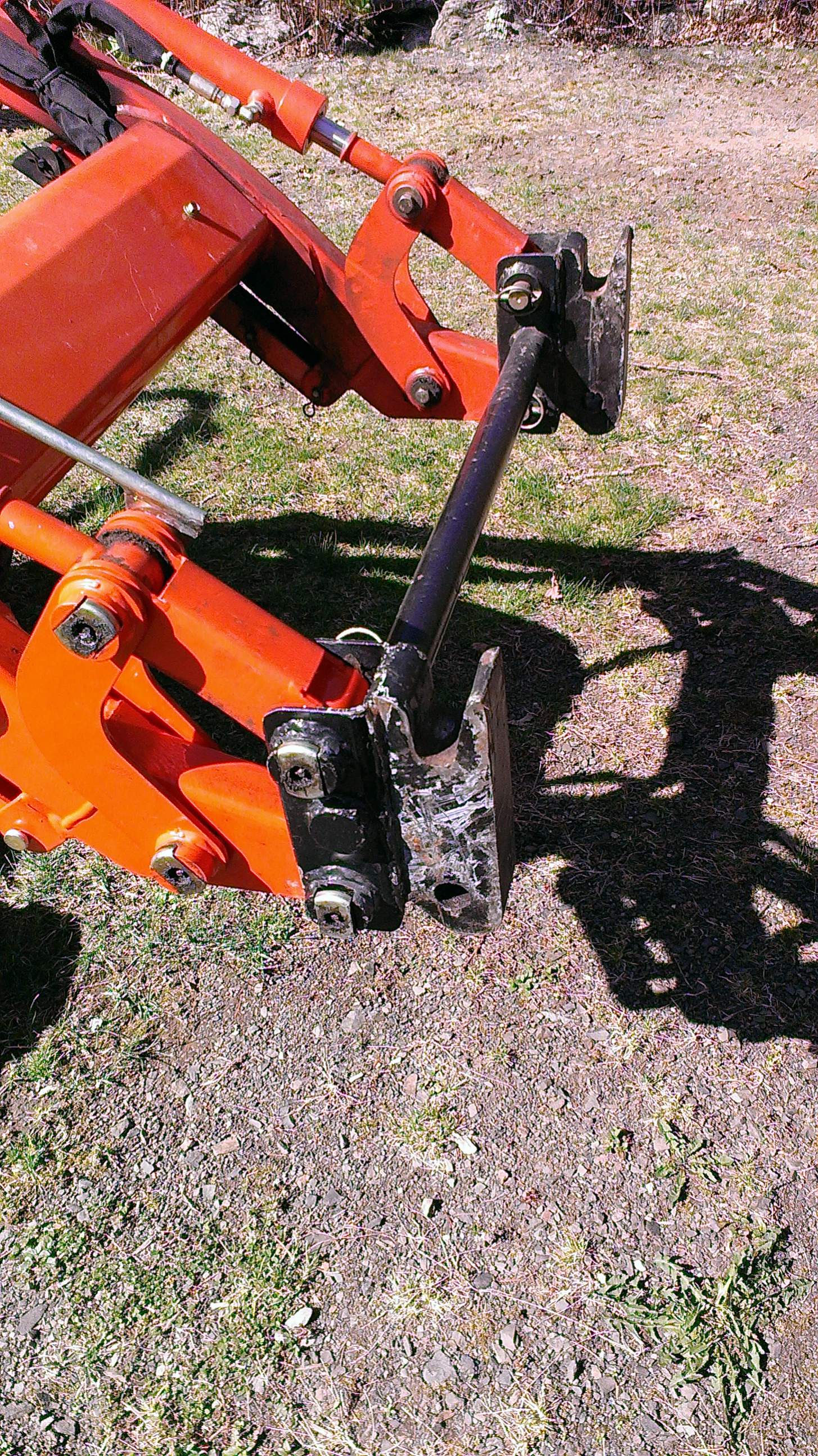 To answer and earlier post about what I call a semi quick detach. It is an add on that allows you to leave the top pin in your implements and you only have to put in the bottom pin. There is a u shaped attachment that is pinned on the tractor. Kind of hard to explain. MIE has them for a couple hundred dollars, but you do not need to modify any of your implements nor the tractor. I looked on their web site, but did not see a picture. Email Bob at rpiro.mie@tds.net I am sure he can send a picture. I only have a bucket and pallet forks, so for me it was not worth having the bucket and forks modified, I think I would have been into it for $800 or $1,000 to go fully quick detach.