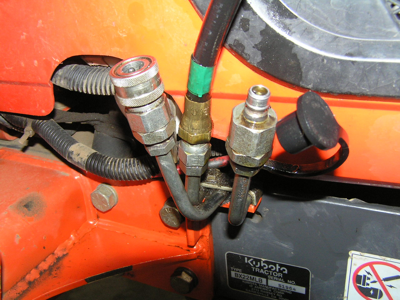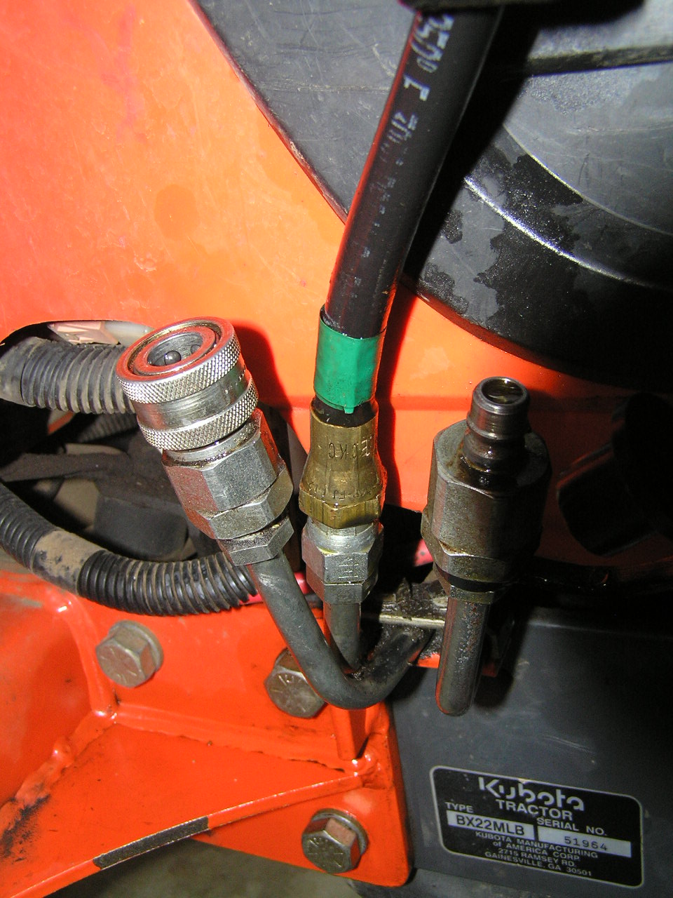 I have [finally] found a slow hydraulic leak - - its from a FEL quick connect line. I have raplaced a hydraulic line on my BH before, so this should not be hard, but it is. I have attached a couple of photos showing the line I need to replace. Problem is, I cannot get wrenches on it to hold the base & break the nut loose. I am not even sure I have the right size wrenches.