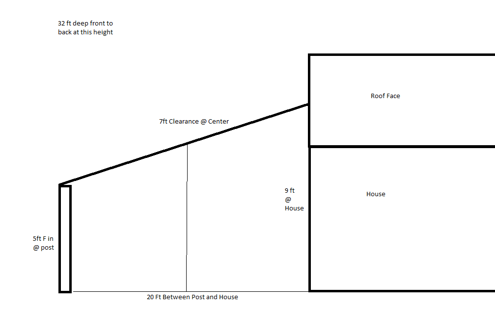 So in these very basic, and not to scale, drawings you can see the lean to shed from one plane. The length or depth of the shed is dependent on the height because of the roof overhang that i'm working with. The taller the shed is the narrower the roof line is. I don't want to go any less than 24 ft long/deep. Obviouisly I can go shorter and gain more length. But is 9ft tall with a 2/12 pitch and 5'5" at the post end TOO short?