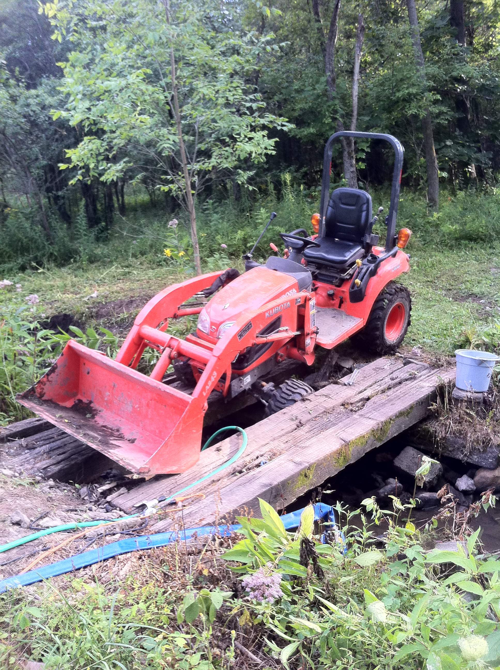 It is somewhat embarrassing to admit this, but I nearly rolled over my still new b2320. I went out right after heavy rain to move a pile of dirt. The ground was soaking wet and after moving a few buckets, a slight rut developed on the right side of the tractor... Right where the back wheel is. I did not have my backhoe attached so the tractor was light. In a split second while backing away from the pile with a full bucket, the tractor rolled right after biting the rut. There was no time to react... I could not believe how quick and easy it is roll this thing. What saved me is kind of funny.... While the tractor was rolling to the right my shorts got caught on the loader control stick.... Somehow my pants pulled the lever down and the bucked dropped quickly.... I sat there maybe for 10 minutes going over and over what just happened. I guess I am lucky to say that I was saved by the seam of my pants. Lesson learned: I will not lift stuff without a backhoe for added weight and stability. A weight box or filled tires will also be considered.