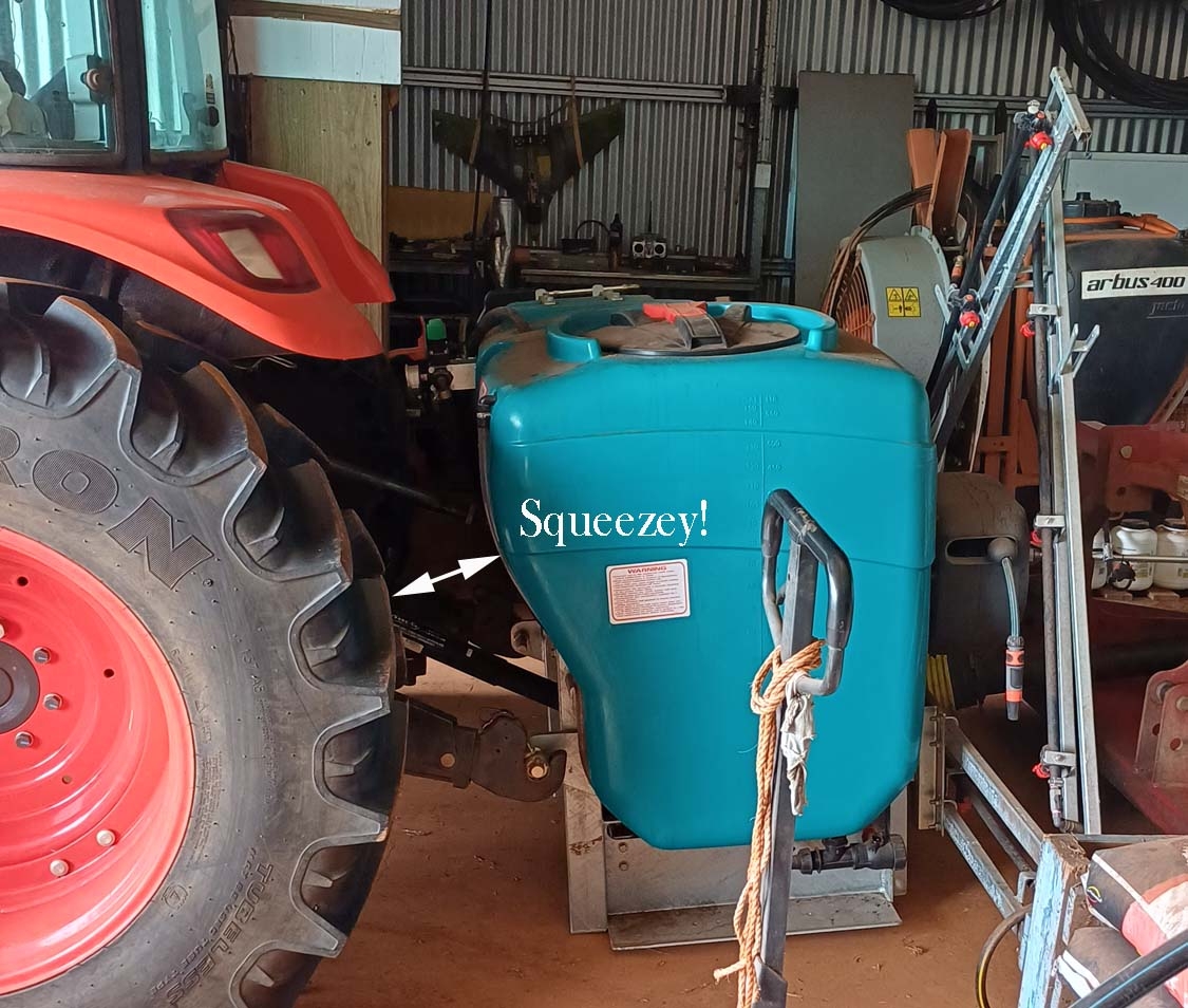 Of all the implements I attach to my tractor, this one is absolutely my least favourite! Getting in there to attach PTO shaft and adjust the top-link is not easy, with the limited space and projecting "things" - like top-link sliding tommy bar, mounting plate for the spray valves, windscreen-washer bottle mounting plate, and of course the PTO guard where the shaft emerges from the tractor makes for some contortionist skills in getting it hooked up.