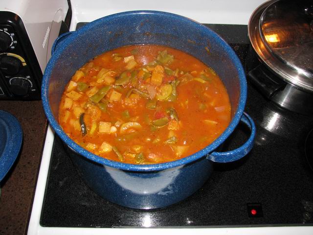 Of course, you always have to add something, so I got a couple of cans of stewed tomatoes, diced tomatoes, a frozen bag of store-bought carrots, and a big onion the size of a softball. While the squash and turnips (rutabagas actually) were thawing, I cut up the onion and got my stew pot ready. I cooked the beans for about 1 hour with onion and spice before adding the rest of the ingredients to the pot. I added 1 quart of low-calorie chicken broth to the mix along with spices to my taste and then put the soup on low heat for the next three hours, stirring every half hour or so. The soup is very close to the taste of minestrone.
