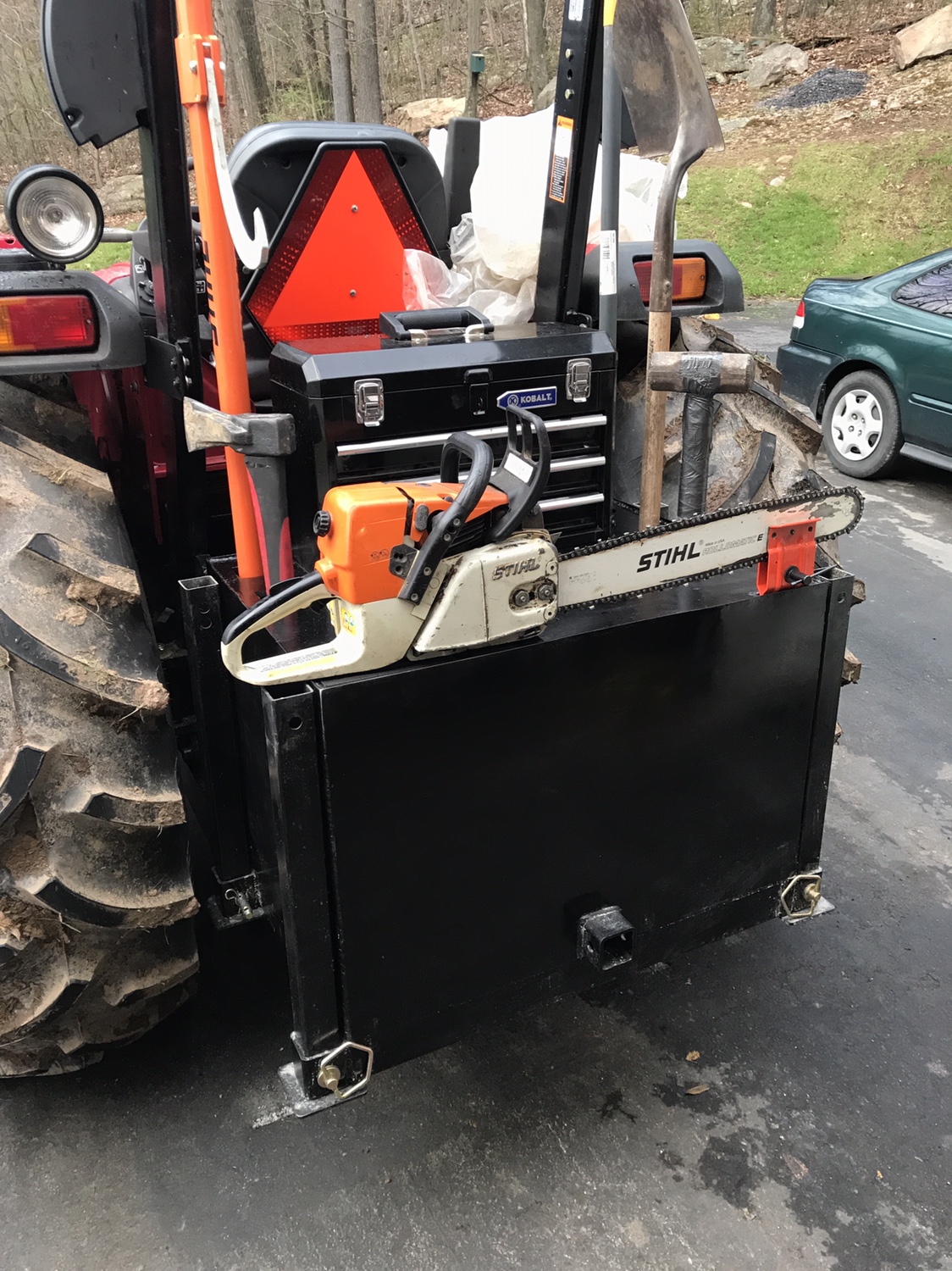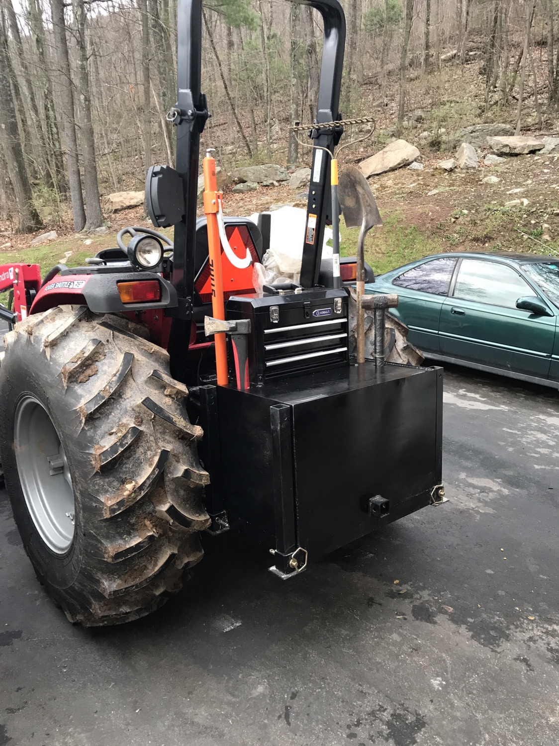 I ended up building this 3pt box that I can put a 30 gal barrel in filled with water or sand for extra ballast if needed.