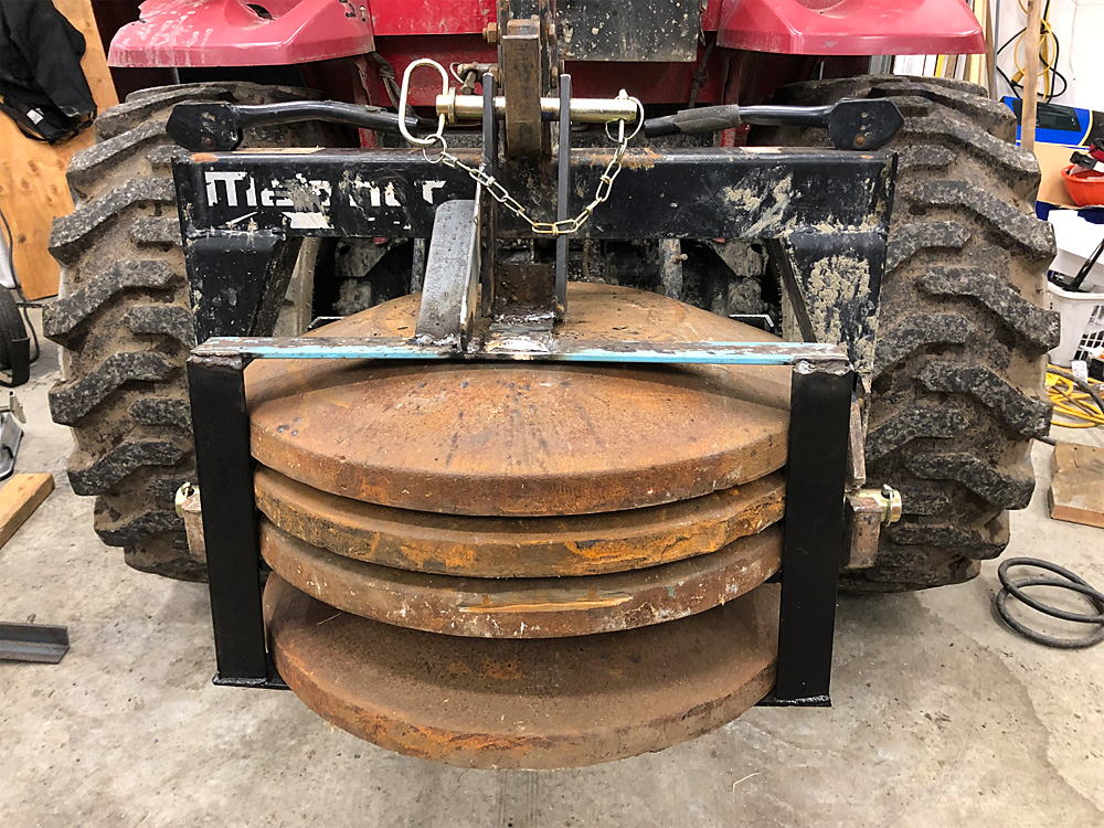 Here's the one I made for our 1526 tractor. Each iron disc is 200#. Bolted through a 26" drawbar with steel framework to hold it all in line. Needs some more paint and finish the brace on other side of the hook. At full down it clears level ground but needs to be raised for hills. Fits in really tight to the quick hitch which is great for clearance in tight spots. Couldn't fit all the weights on top of the drawbar so one had to go underneath. Tractor does much better with loads in the FEL bucket and forks.