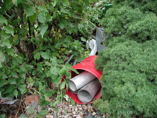 Among the trash cans and bushes hidden is some aluminum plate, steel plate, rebar, and mesh. Draped over the electric meter is the propane fill adapter. Wally
