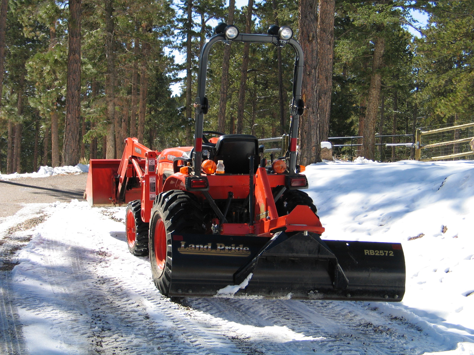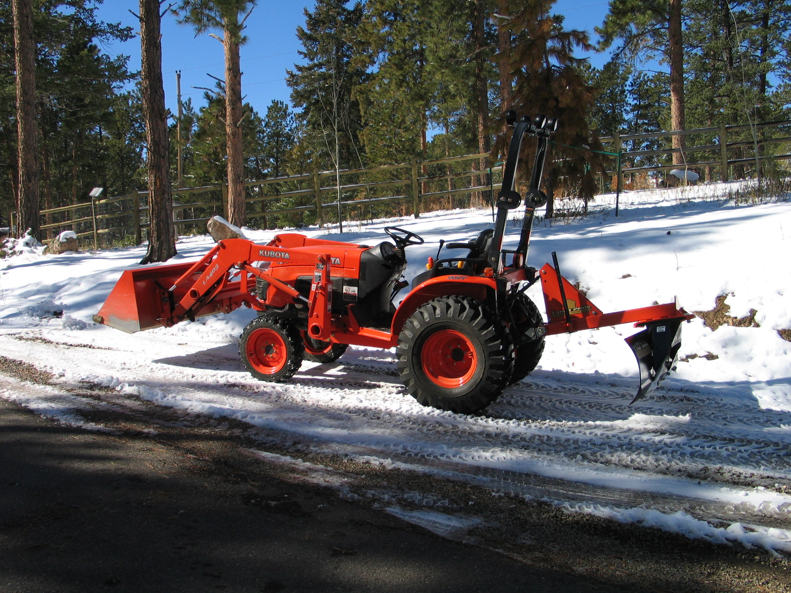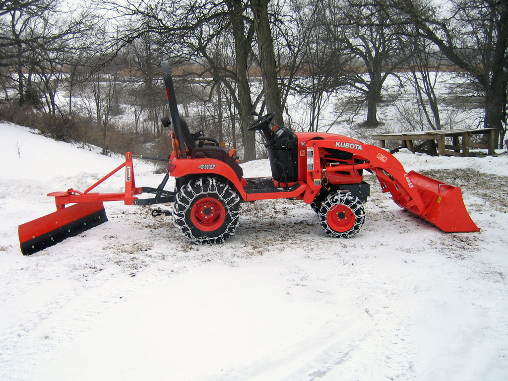 I will have to take some pics to post but I just finished adding one of those $120 salt spreaders designed for a 4 wheeler on the back of my BX2350. I mounted it on the roll bar high enough so I can still use the backblade on the 3PH. So my set up is a front mount snowblower, backblade, and salt spreader with chains on the rear tires. My driveway is paved, about 800 ft long, with 3 90 degree turns, 3 steep hills, and a bridge. I have used the 2350 with snowblower and backblade for 2 years now with great success. I added the salt spreader this year so I dont have to do that by hand this year. Looking forward to a real test.