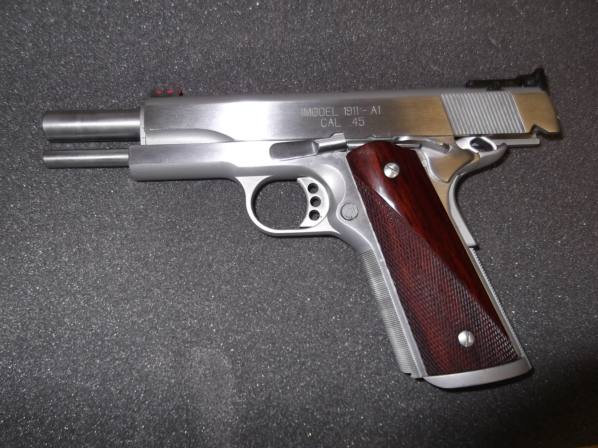 My springfield amory 1911. That started life as a box stock parkerized gun. I put some money in it since. Wilson ramped fully supported barrel, SA mag well, Solid guide rod, Ambi safeties, custom grips, Beavertail, hammer, Hard chrome job. Videcki trigger, Bomar's etc. In other words I put about another $1000 into the gun over and above the $350 of the original purchase. This gun has had a LOT of rounds thru it in USPSA competition. Still a good shooter though. Of course you can buy guns set up like this now, but you could not in 1991 when this one started life.
