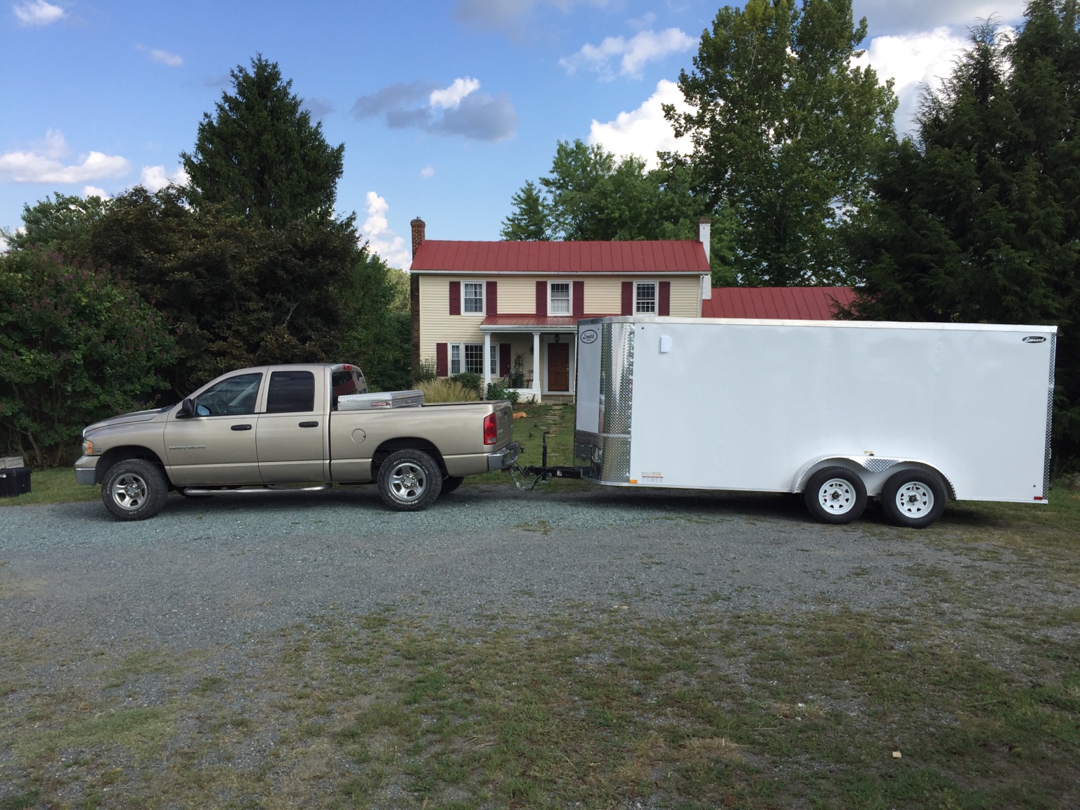 After considering all the information that was shared here, I pulled the trigger this morning on a 7x16. V-nose from Leonards. Manufactured by Arising Industries. It will do the trick and with some rearranging of things we are going clear out a storage unit that we are currently paying $290 a month for (mostly tools I need for the build. Will probably keep it 1-2 years for tool storage until the house and barn are built and then sell it. i think I will actually come out ahead and I will have my tools handy. I had them put an additional hasp bar on the side door since it only had an RV style lock. I bought four masterlock Magnum locks for it for all three door locks and the tow hasp And I am going to call my insurance guy Monday and adjust my policy so that all the tools and the trailer don’t wipe me out if some dirtbag breaks in and steals me blind. My bride is delighted. I told her to organize me and she has been busy putting shelves together for the trailer and pulling tools out of the basement to go in there to make room, for the last 4 hours.