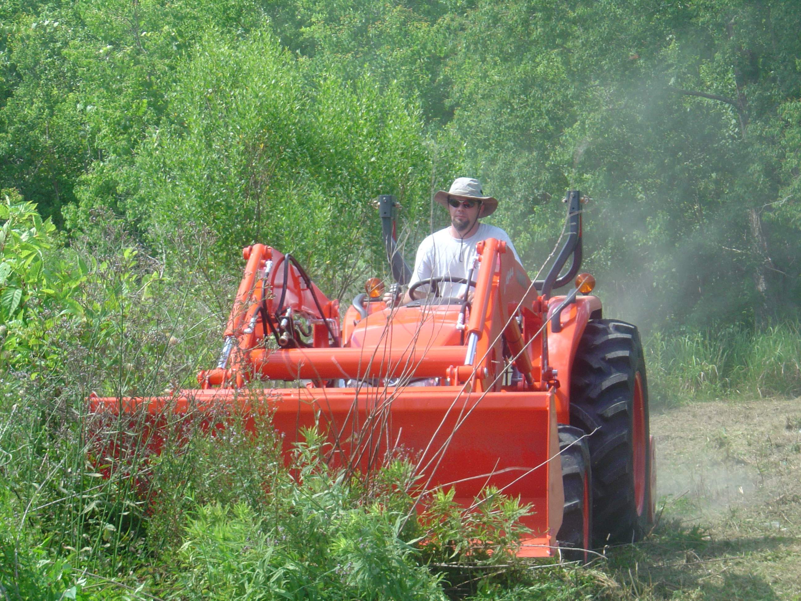 With my flail, I cut grass 6-8" at a pretty good clip, I'd say 4-5 MPH or so...with brush, I move much slower. I dinged the heck out of my knives by going over brush too quickly. The racket really made me nervous, so when I saw something larger about to go under the flail, I sped up to get over it quicker. Since I got new knives and hangers from Flailmaster, I have started slowing down to a crawl over bigger stuff and this gives the knives a chance to chip away at it without throwing them back into the drum and banging them up. The original shackles were so worn down that the tips of the knives contacted the flail housing! :eek: