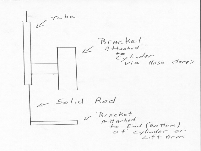 I knew this question was coming! Attached is a rough sketch of the load level type. It is basically a stick figure. Now you know why I want a CAD program. The "T" bracket gets attached to the tilt cylinder with to hose clamps. The bracket on the bottom of the rod get mounted to the lower pin area, either with a hole on the pin or directly to cylinder piston end or to the lower arm its self. My sketch just shows the idea. I have thought about Peter's idea about a cable (throttle, transmission down shift cable, bicycle cable). The only slight difficulty I see with the cable is the amount travel the piston has. I'm sure there must be a way to do the cable idea. I personally like the cable idea because I have a cab on my tractor.
