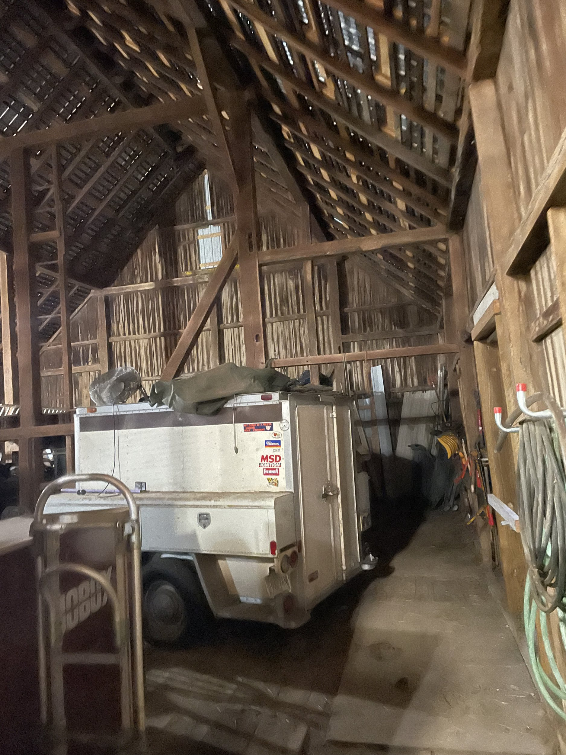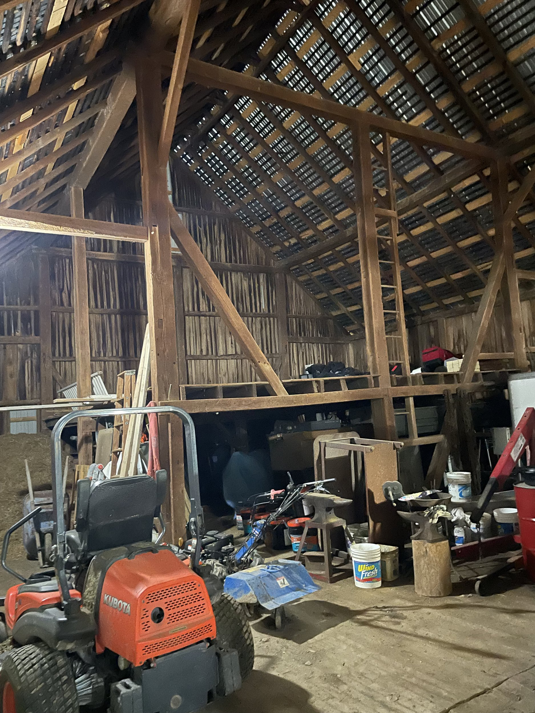 I grew up filling hay lofts using the rail at the peak of the roof. Wagons parked outside the loft door. Hay forks could pick up 4 square bales at a time. Rope/pulley system went out the back of the barn where a tractor was used to pull the hay inside the barn. Great memories.The down stairs was used for the farm animals and is mostly unused. The milking parlor at one end I use for storage currently and the other end has a feeding area with cribs for feed. The middle area has pens for animals. Hay was stored on the two mezzanine decks upstairs and trap doors allowed for dumping hay down to the lower floor. Also there is hoist under the top beam in the roof that was used to hoist up hay to the mezzanines. It runs the full length of the barn