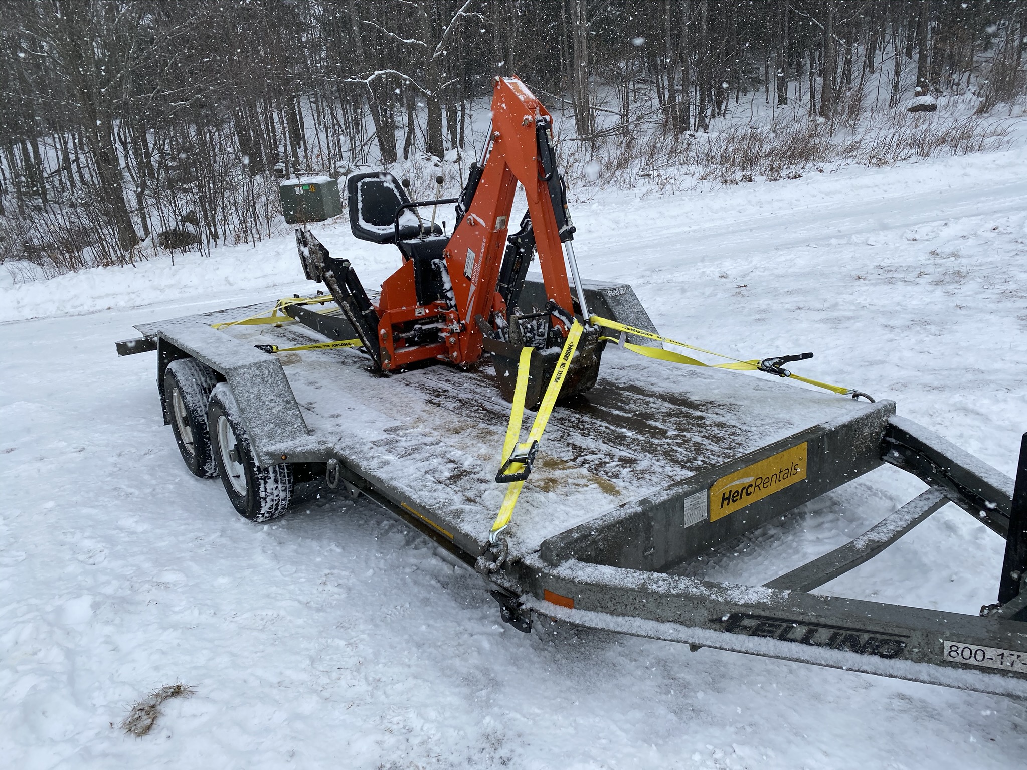 Used 4 3,333lbs straps to tie the backhoe to the trailer and 1 1lbs to tie top of the subframe to the trailer. By the time I got to the seller it started snowing in MA and I was bit nervous driving back through the endless mountains with the fresh snow on the ground - about an hour drive through local streets (40 mph speed limit) and 2:30 highway. Once I got the the highways I was relived.