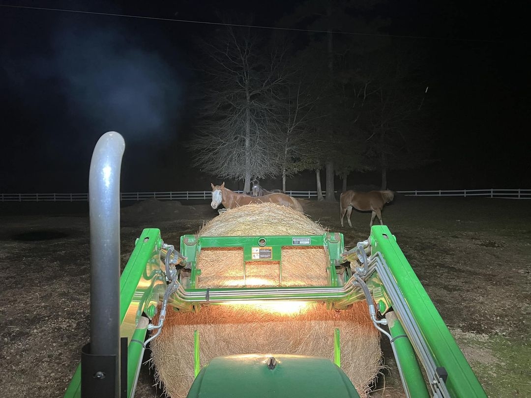 When the days got shorter, I had to work in the dark to put round bales in the hay cradle. What surprised me was that the head lights where totally blocked by the hay bale. In the picture, you can see where the headlights shine on the bale. I couldn't see anything past the round bale with just the headlights.