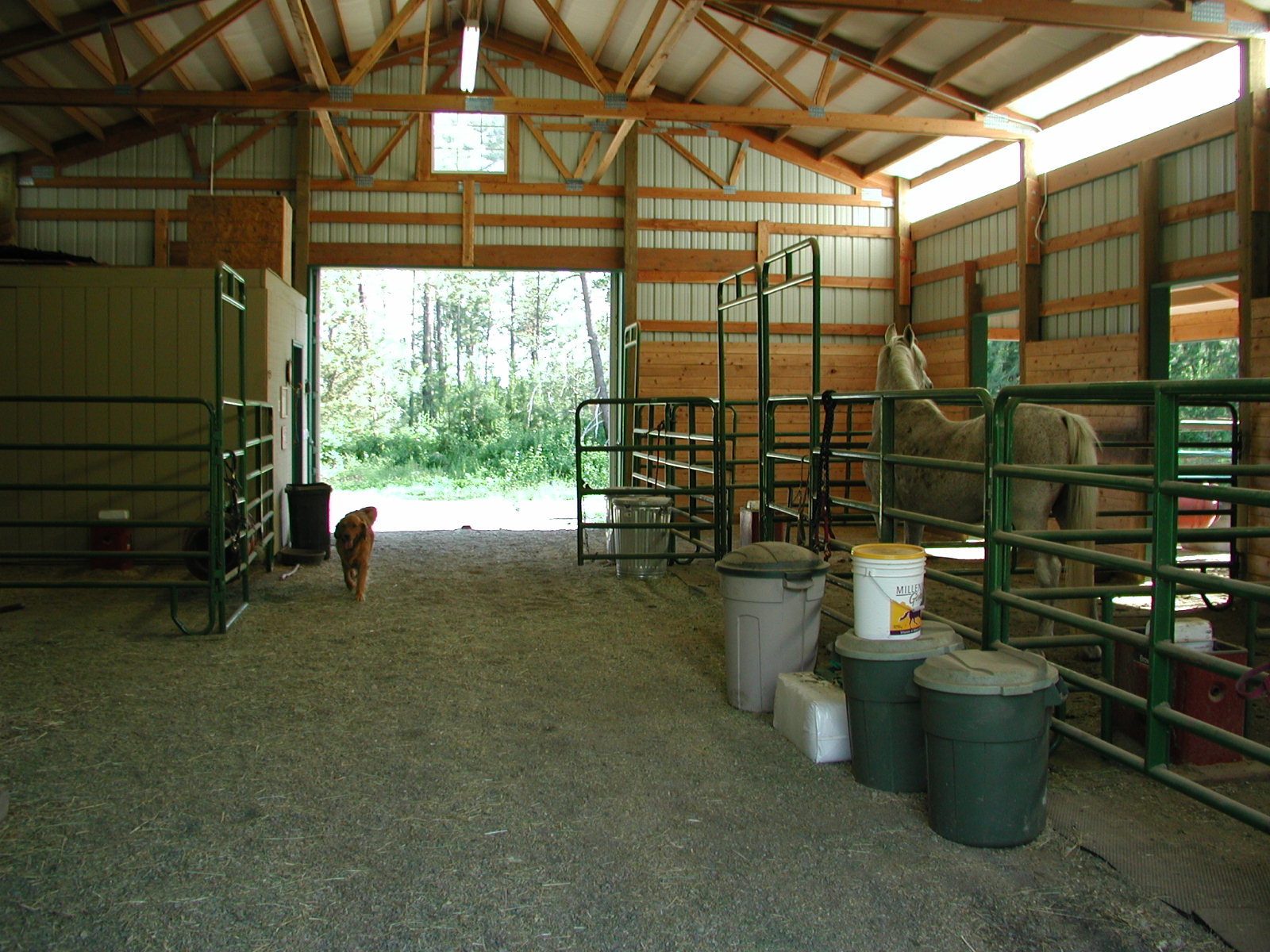 For the central barn, i personally would use Three (3) 8 foot T8 tandem fixtures (each light uses 4 - 4' long lamps. Use at minimum a 4,100K lamp for cool white lighting as this seems to be the best look in a barn. I have also used 5,000K and 6,500K lamps for REAL bright (almost bluish white) lights for clients that want it superbright. Spaced 2 feet from wall to 1st light. then 4 feet between fixtures.