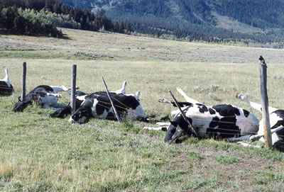 The attached photo is of cows who happened to be standing near a fence when lightning hit close to the fence.