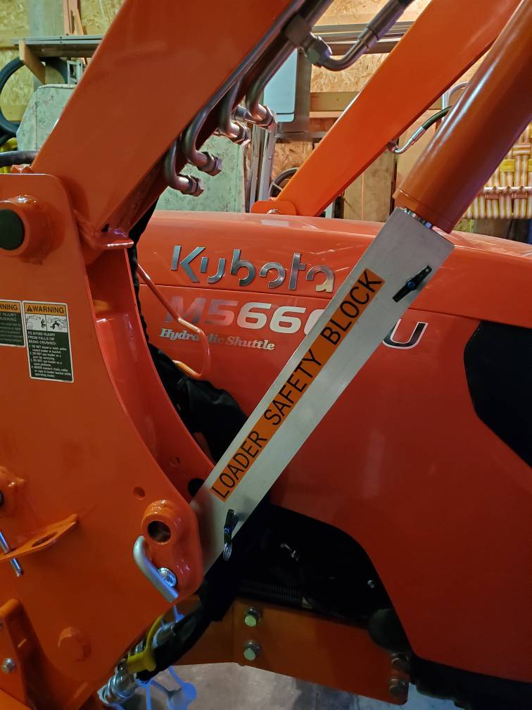 Raise loader, apply safety block, turn off engine, slowly lower the loader boom.