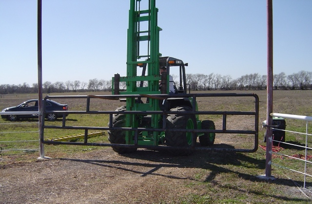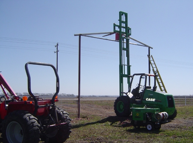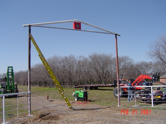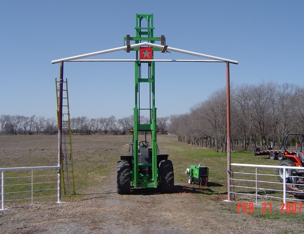 Time for the final batch of pictures. This batch is of hanging the arch top. My Massy wasn't up for the challange. I had to rent an all terrain fork lift and a larger welder for the job. Arch is 15ft 8inches to the bottom cross pipe.