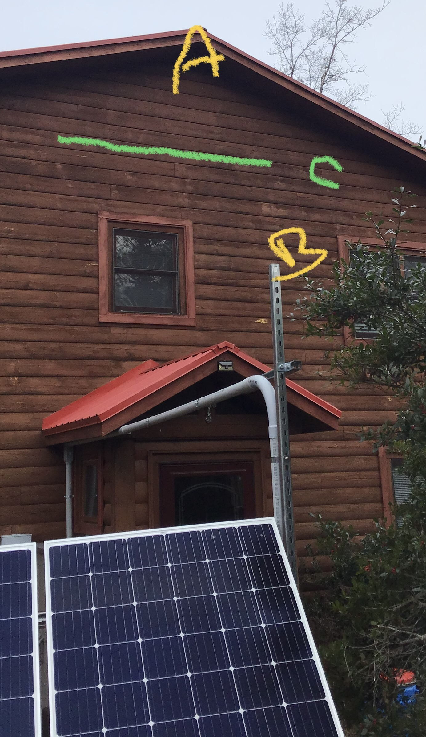 ”B” is where I will add another 10” piece of UniStrut and place the antenna atop, which will put it at approximately the height “C”, and I can run the cabling inside the 2” conduit that my solar cabling runs through. That will give sufficient sky visibility until I can relocate to “A” hopefully before tree leaves appear. . .