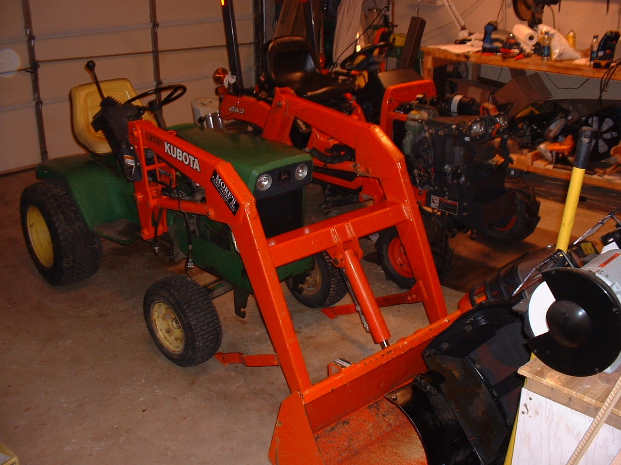 Kudos to the thread. Yesterday evening, I took my BX2230 and finished a small trench for spring thaw with the Wood's Groundbreaker-X (BH6000), scooped the loaded piles of earthen clumps with the loader (how do you turn up the lift?) and made numerous trips to the field, got back in the garage by dark and by kerosene heater (and a tall Ardbeg on the rocks) dropped off the loader and BH, stowed away in the garage for winter, put the arms back on the 3PH, took off the BX grill guard, hitched, leveled and snugged the ballast box, loaded on the front Quick Hitch hyraulic lift (spelling or scotch?...you decide) and proceeded to hitch the BX2750B front mount snow blower. Finally, connected the long and short PTO shafts, bolted the manual chute rotator arm, tested and parked to wait for the first snow.
