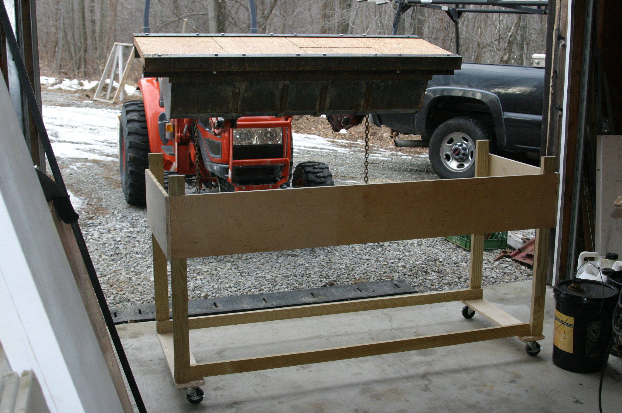 My first plow was a piece of 16" X 48" 3/4 plywood, bedspring angle bolted to bottom for cutting edge and couple short 2 x 4" vertically that had pusher arms attached mid way as well as more 3/4" ply scraps to brace the pusher arms.