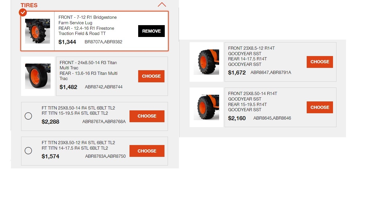 Here is the link of the configuration page which seem to have all the options: Kubota Tractor - Build My KubotaTried again.
