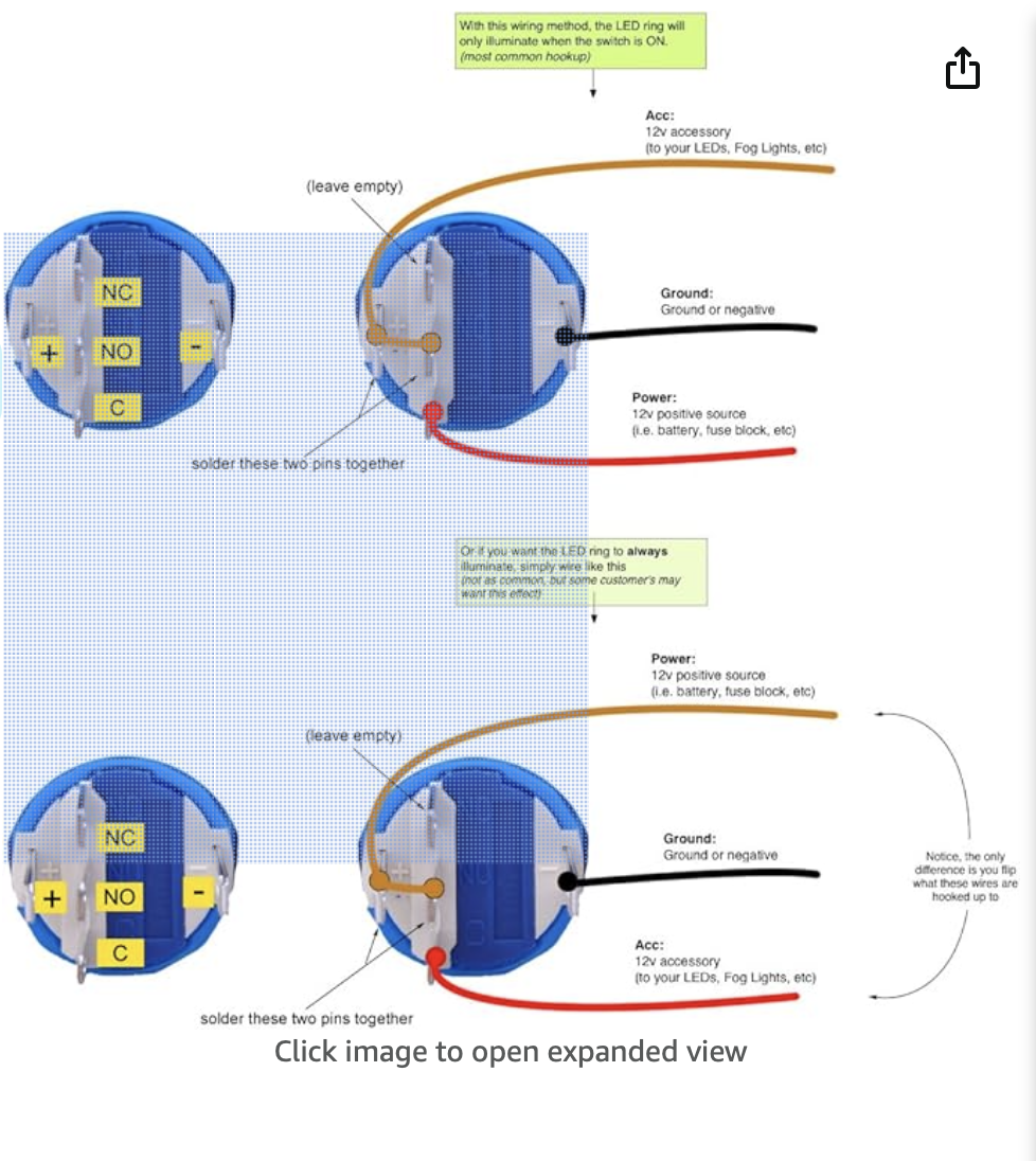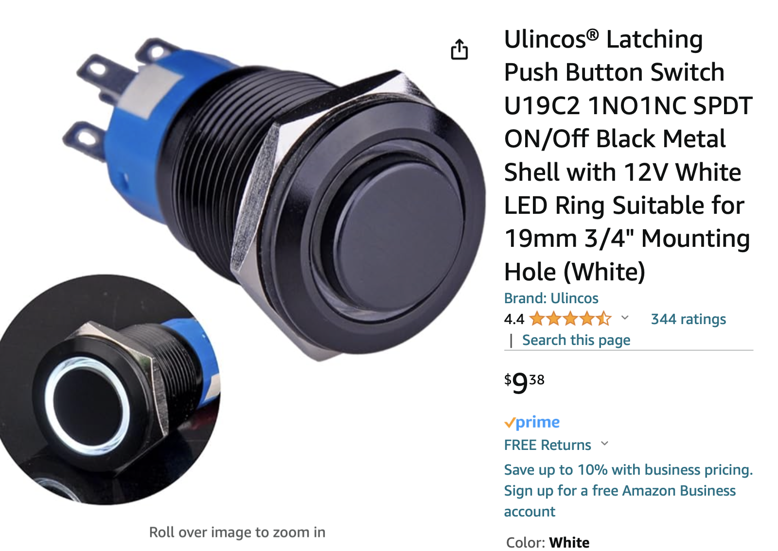 I actually bought several and threw the unused ones in the electrical drawer to see if they would reproduce. Near as I can tell, all the switches are the same high quality & they all work the same. Some have sockets, some have colored wires, others are push-on connectors. Key words are: 12V, 10 amp, on/off latching, 16mm (5/8"). and the designation "1NO1NC" or something close to that.