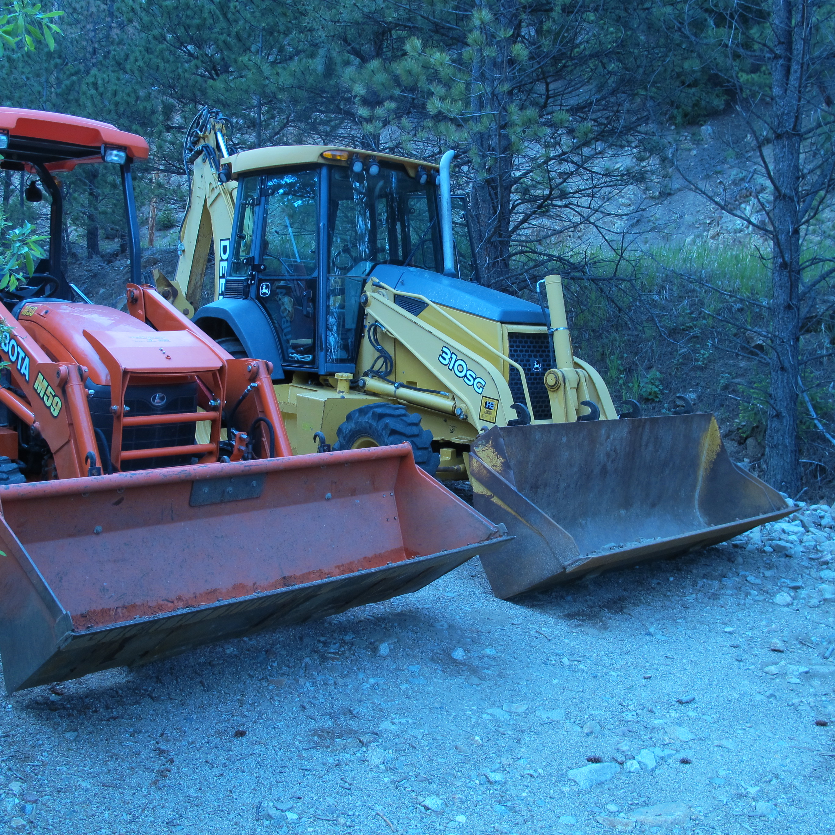 M59 and a JD310SG. These are not used for commercial work; they are both just used on our mountain property in Colorado and for helping with occasional chores for neighbors. We are still rebuilding & landscaping from a 500 year flood that swept across our land in 2013. It completely reshaped the land, moved the creek, filled in the pond, and left a mountain of debris and boulders. There has been more than enough work for two machines. At first we did a lot of hiring bulldozer & excavator time..