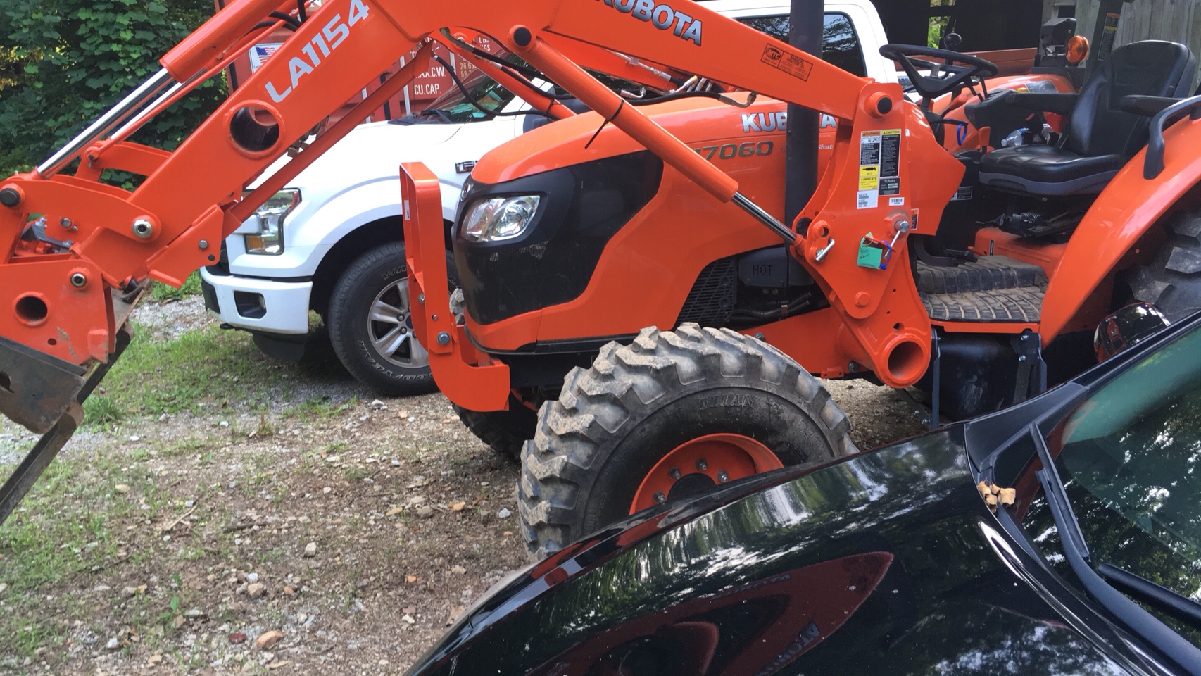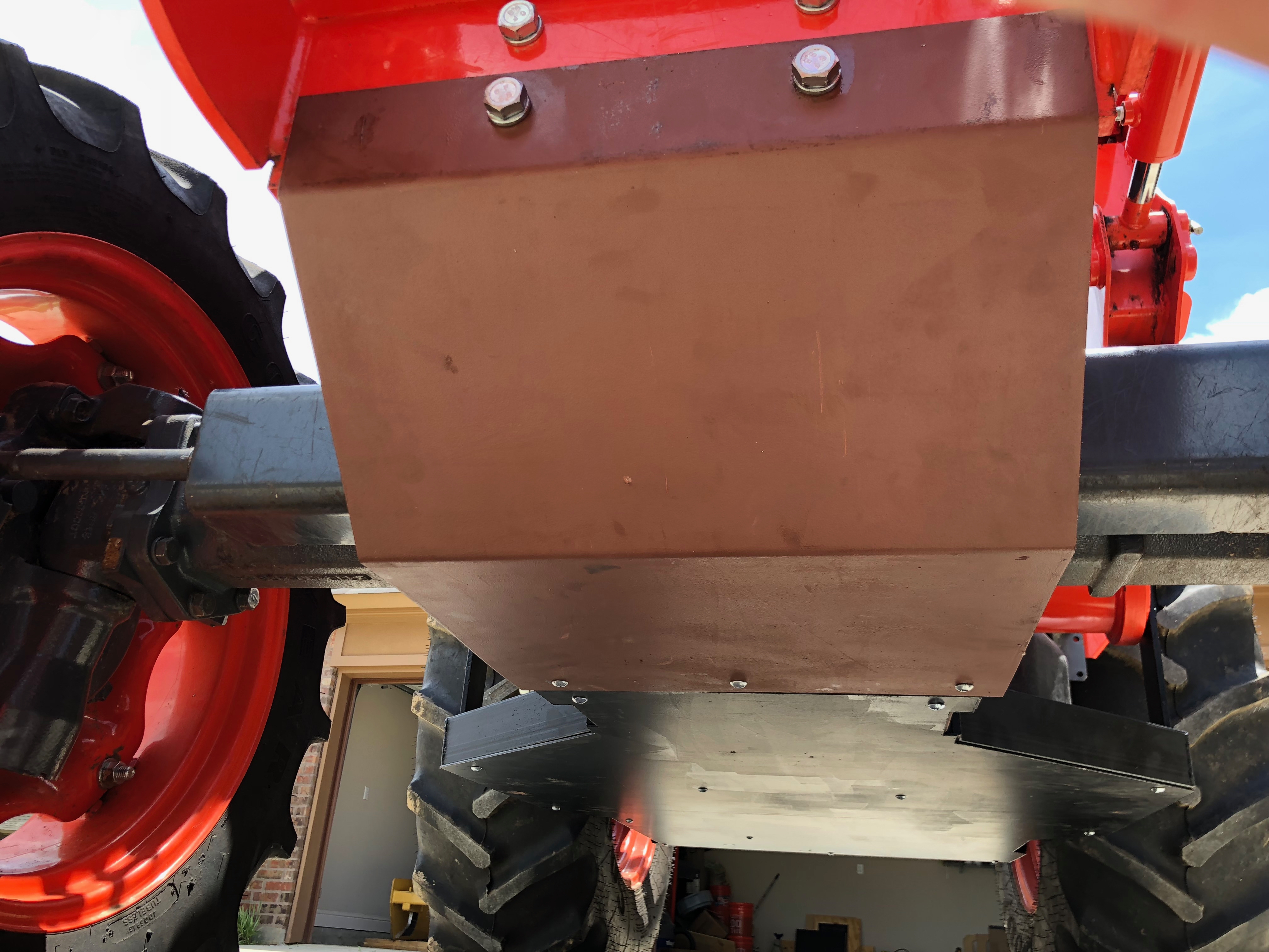 the front of the tractor is to the left on both pics. The 2nd pic shows the side protection of the fuel tank (cut up plastic bed liner) and a big step. Working away from the step is (the angle pc.) that protects the loader q/c's, then a tool box and saw carrier that is a part of the side banel protection from sticks entering around the delicate hydraulic components, filters, etc. The rear tire begins directly behind the step and box and so far, nothing has got past it from the side, the bottom is of course the steel pan.