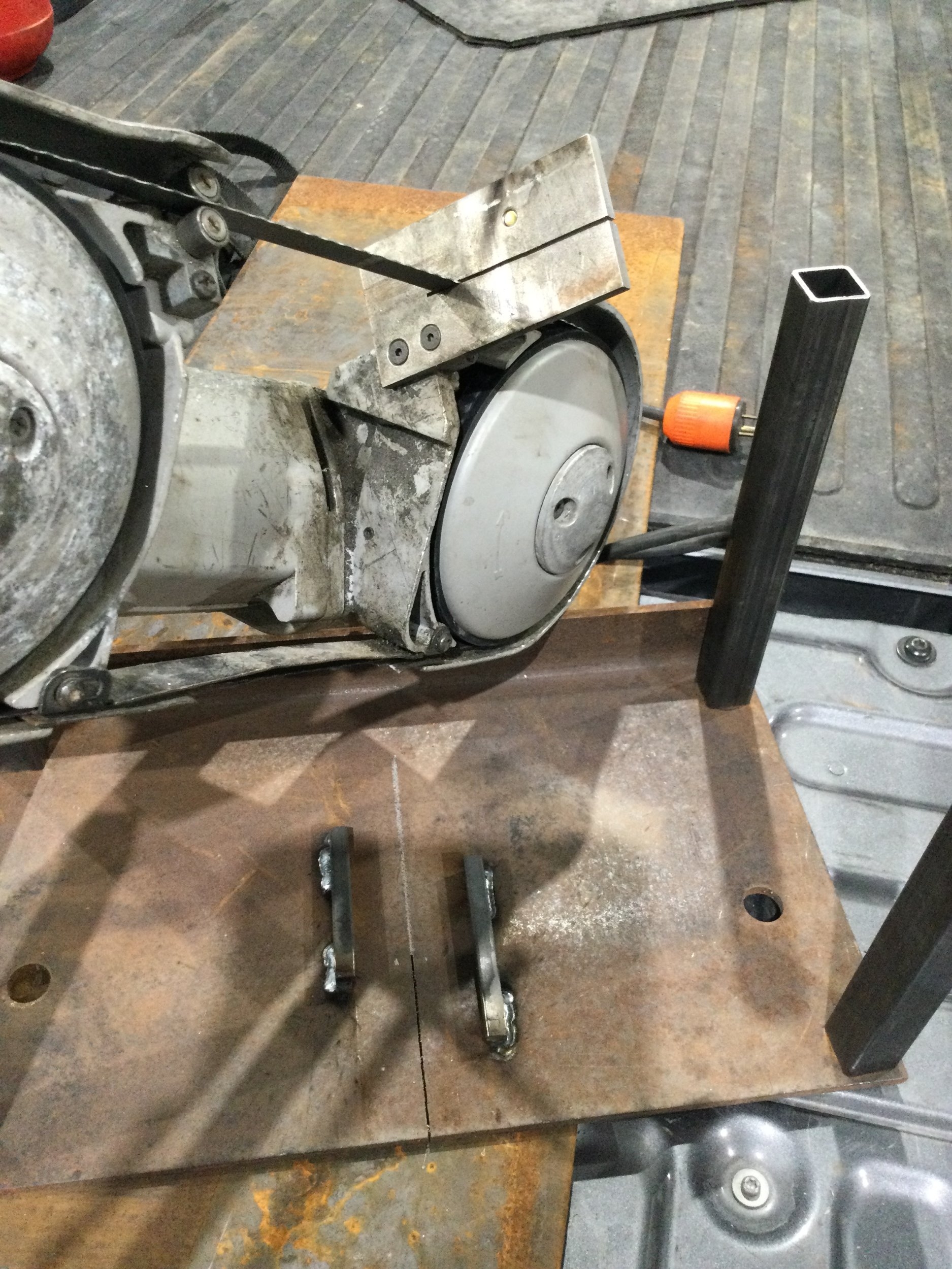 This is the 4th one I’ve put together and they are all slightly different but are based on some 1/4” tank feet that cracked on the edges when bent, used for the table. A ziptie holds the trigger down and I use a foot ”on/off” switch on them in most cases, clamped to the table on the right on this one, so I can sweep under the table without having to get stuff off the floor.