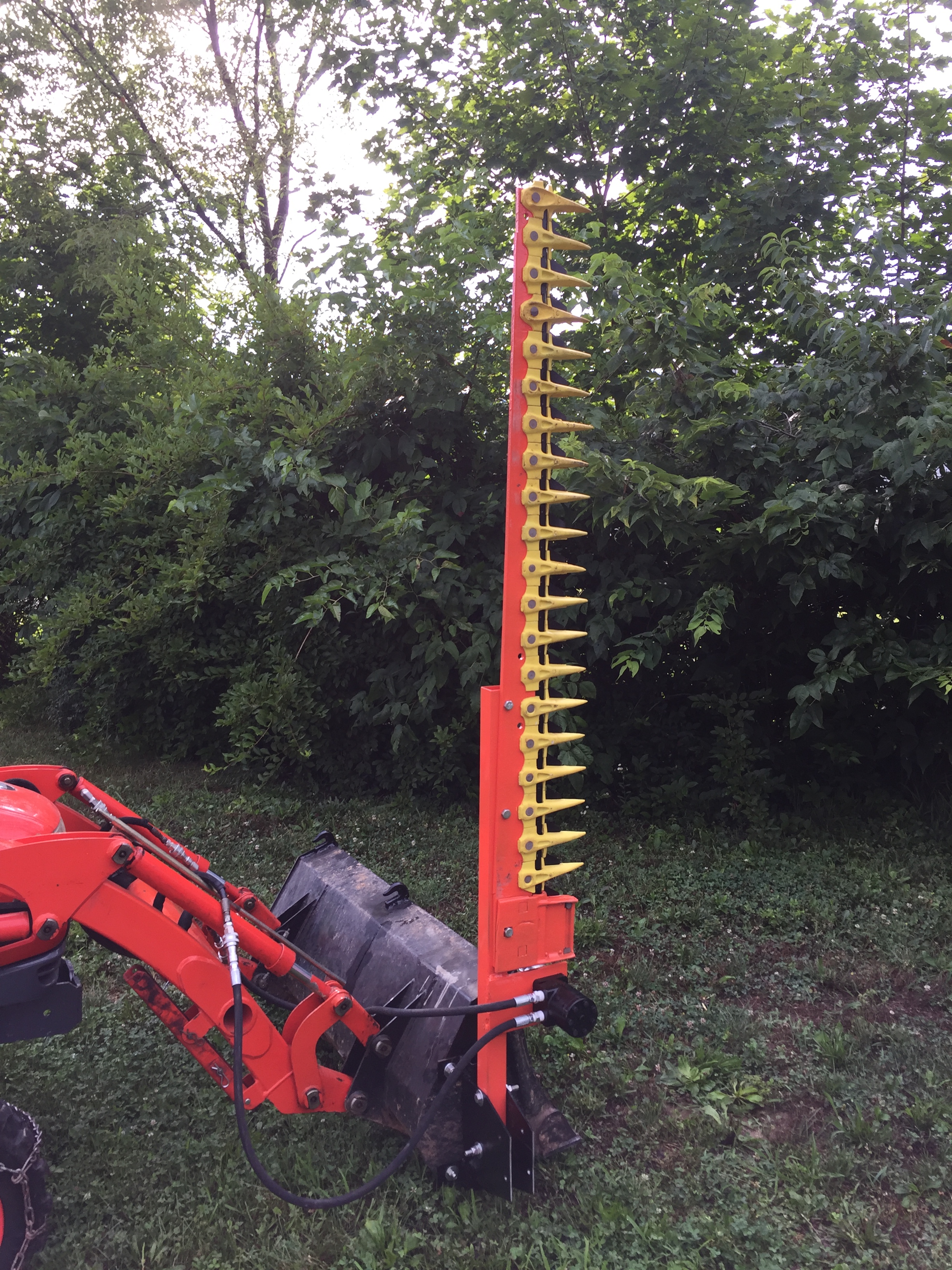 I have a hedge row that is about 250 feet long and it takes me several days every year to trim it with an electric hedge trimmer. I decided to build a man sized hedge trimmer for my Kioti. I went looking for a sickle bar for a Cub and found one. I sand blasted it and painted it then started designing a mount and drive system for it. I bought a hydraulic motor and machined an eccentric flywheel. I took it out for a test drive and it now takes me less than an hour to trim the entire hedge row.View attachment 564482View attachment 564479View attachment 564480View attachment 564481