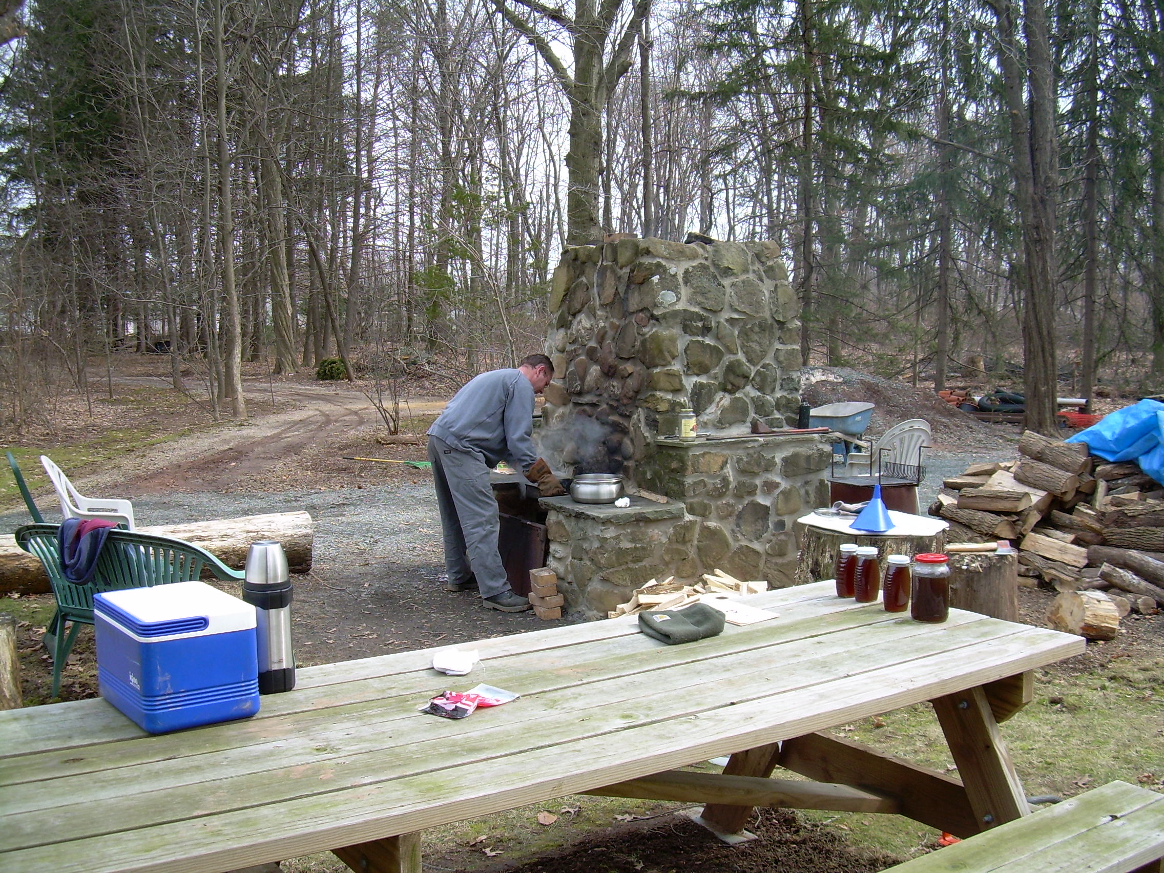 the dividers act as a separation point and helps support the bottom. the dividers have one corner notched out so if you pour NEW sap into the one side/end the warm sap that is closer to being syrup is pushed around to the other dividers slowly and I have 2 small plugs that I put into the notched corners to keep the boiled down stuff separate from the close to done stuff. This way I can pull off SYRUP from one of the last divider while pouring in NEW sap and not have to worry about getting too much water into the near finished product. I drain off several gallons once the temp comes up to ~215 degrees from the wood fired big pan, I have a smaller S.S. pan built the same way that I use to get the syrup up to ~218 degrees. It sets over a dual burner camp stove and holds 5 gallons as a flat open pan. Both pans have Ball Valves taps on the bottom corner where I drain off the boiled down syrup off into finial pan. I have a 40 QT sauce pan that I do my final cooking and canning from usually inside the house. Final boiling point is 219 degrees F. Most commercial sugar people use a Hydrometer calibrated for SYRUP cost 30 bucks. mine did not last the first use, it broke as I put it into the cup the first time ruined a cup full of syrup and POed me good. I bought a Digital Temp gauge that goes to 250 degrees F, set up for Oven Cooking of food has beeper an all for 9 bucks at wally world. You have to calibrate it for the day you are working using Boiling Water 212deg F, then add 7 degrees F for proper Syrup range +/- 1.5 degrees is OK but too much cooking it gets dark & sugar will drop out in a gritty form very fast and can scorch. the link on page 2 I posted shows a PIC of when the big pan got low the Black Spot in one corner, that scorched some and is hard to clean up, but adds a smoky roast flavor.