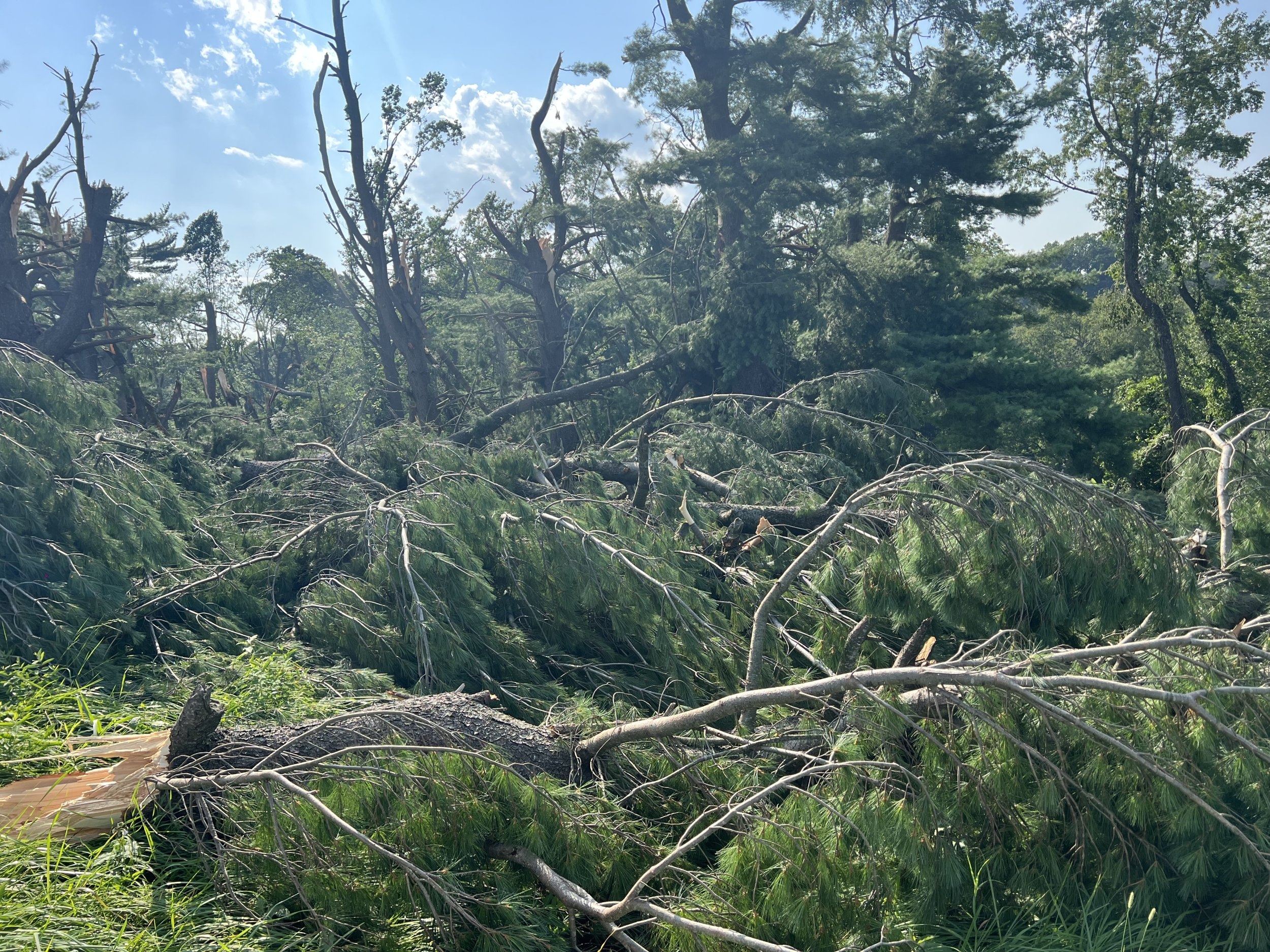 Some pictures of the damage. Looks like a hurricane came through, but it’s isolated to a small area-maybe 1,000 acres, and the strangest part is it’s a very narrow swath.