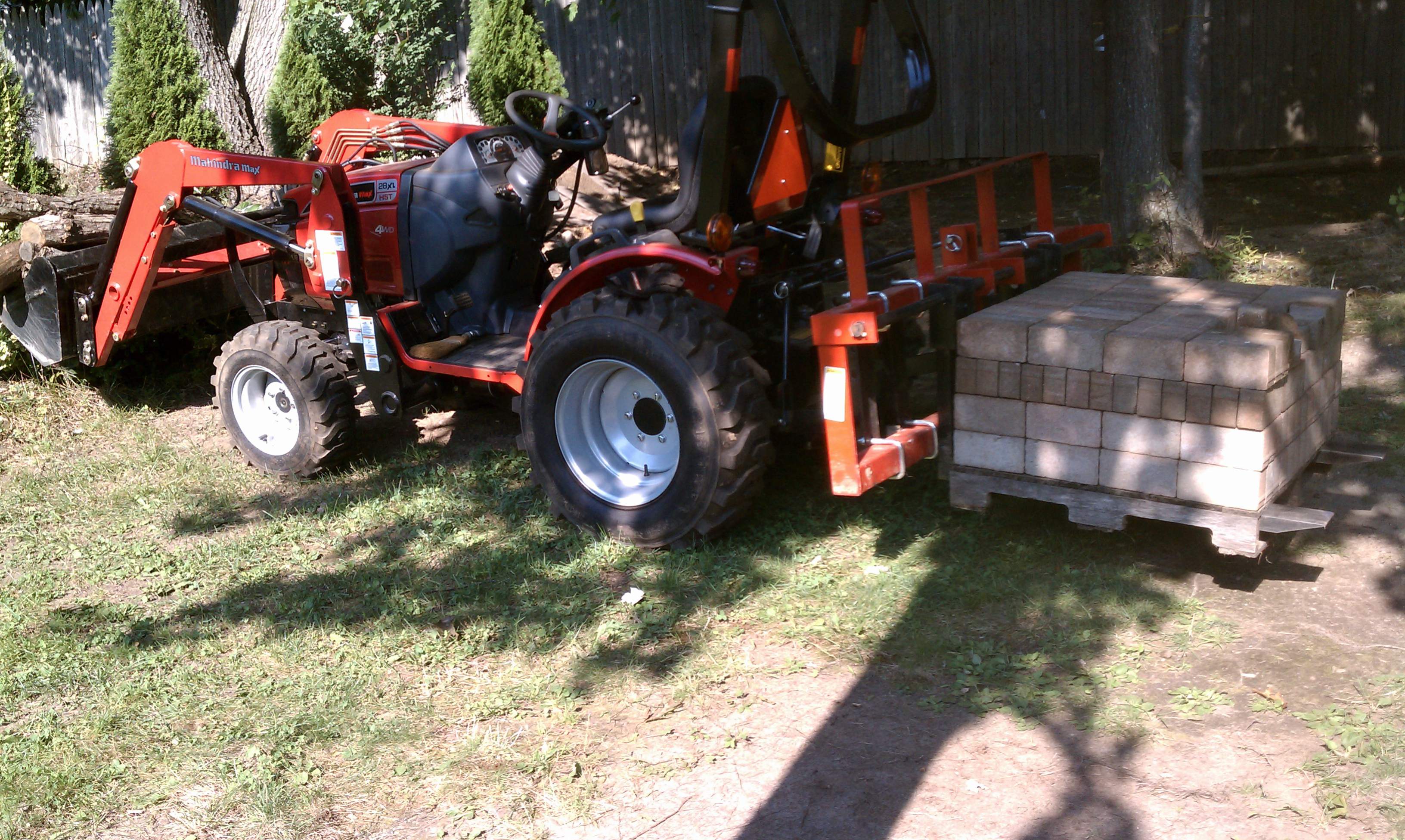 FYI, if I could do it over again, I would choose different loader forks. These are strong for the 3pth, but they are really designed for a stronger/larger tractor. Dealer told me they were 200lbs at purchase. I think, like those in northern tool, they are 350lbs.