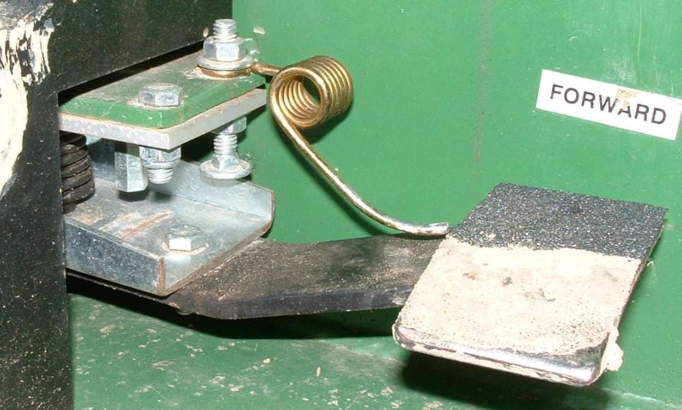 Since backing at full speed in a lot of spots on my property should probably be preceded by a suicide note, I decided to limit the travel of the reverse pedal. I took out one of the bolts above the right pedal and replaced it with a longer one and a double locking nut. This let me adjust the maximum reverse pedal travel to a safe amount.