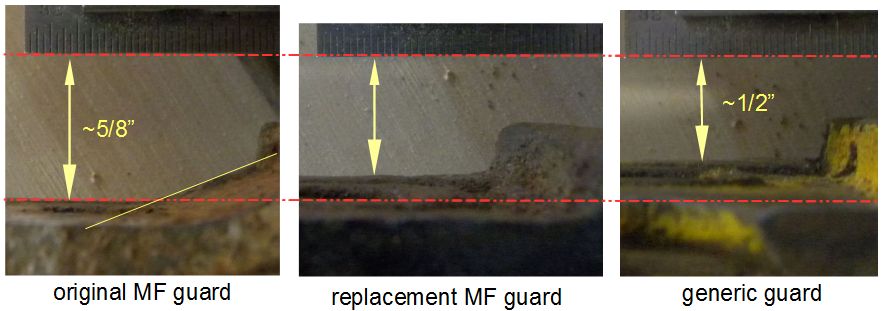 I've pulled the cutter bar of the MF 31, and removed all of the guards, hold down clips, wear plates and shims. I also removed the sections, which were all bad, with the exception of maybe two that were marginal. The ledger plates were all very bad. All of this probably explained the jamming, and probably also the broken bolts. Some of the guards had broken or bent "ears". There was a mix of guards including about half that appeared to be original MF, one that was a later MF, but not the correct one since it didn't match the beveled bottom front edge of the bar, and four other miscellaneous guards other than MF branded.