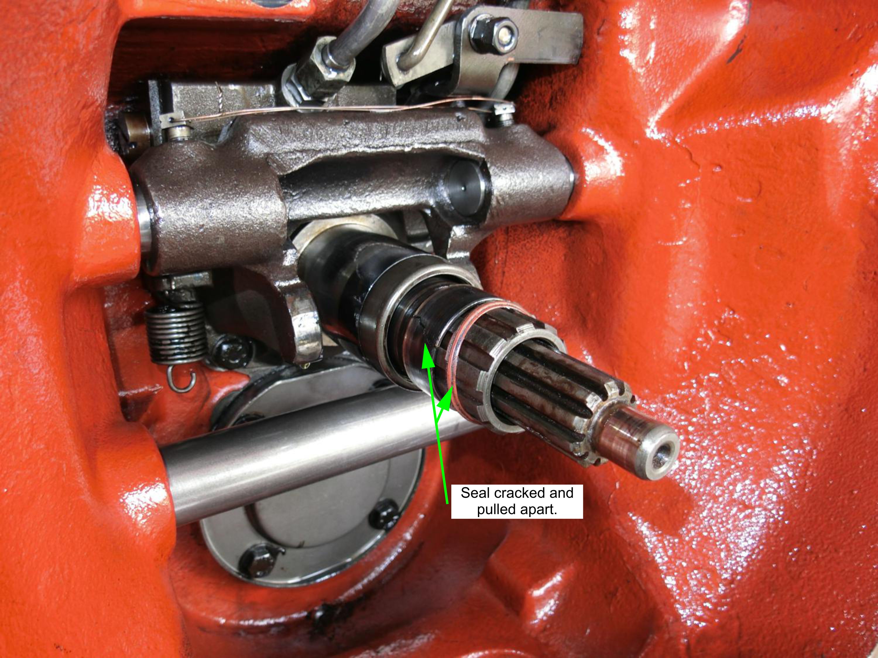 And, as you can see in the attached pic, the problem was pretty obvious the moment the light of day hit that input shaft. It seems the main seal has cracked apart, rather dramatically.
