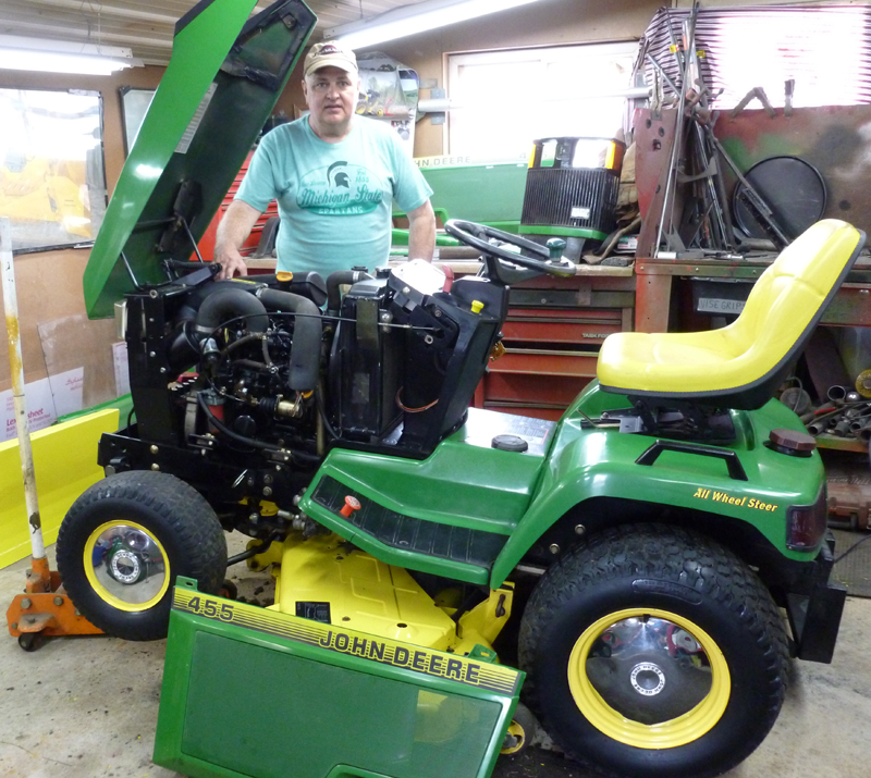 Today I pulled out the jd 455 with cab and snowblower and pulled in the jd 455 mower tractor. Change oil and filters and sharpen blades. Just a wax job yet, wax on , wax off:dance1: