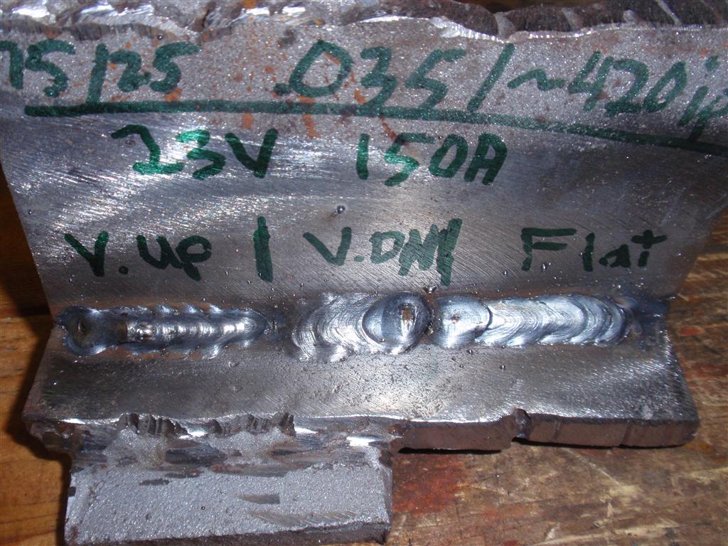 I tried everything from 18V/200 ipm to 24v/450ipm with 0.035 wire and C25 gas on 3/8" steel. I tried pushing uphill, dragging and everything in between. I used a straight-on torch angle and everything from a slight angle up to a severe angle up. I went fast, I went slow. I whipped, I zigged and even zagged. They ALL look the same. Drip drip drip