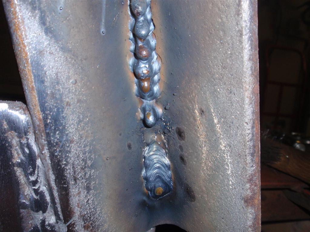 In my welding class we did a ton of out of position work, but it was all stick. I got to the point where I would call most of my vert up "acceptable" with stick. We did literally about 5 min of MIG in the last class, just for giggles. We didn't try anything out of position there as it seemed so easy. Flash forward to now. I have a really good welder - Miller XMT304 and 22A wire feeder. I can run flat position beads that look pretty decent overall. I can get good penetration and relatively smooth beads (depending on how steady I am...). I cannot, for the life of me make a vertical up bead work. Vertical down- no problem. But vert up has been a total mess. I get melted blobs that drip repeatedly every little bit as I go. See the mess? The one decent bead was vert down, just to see if I was crazy or not.