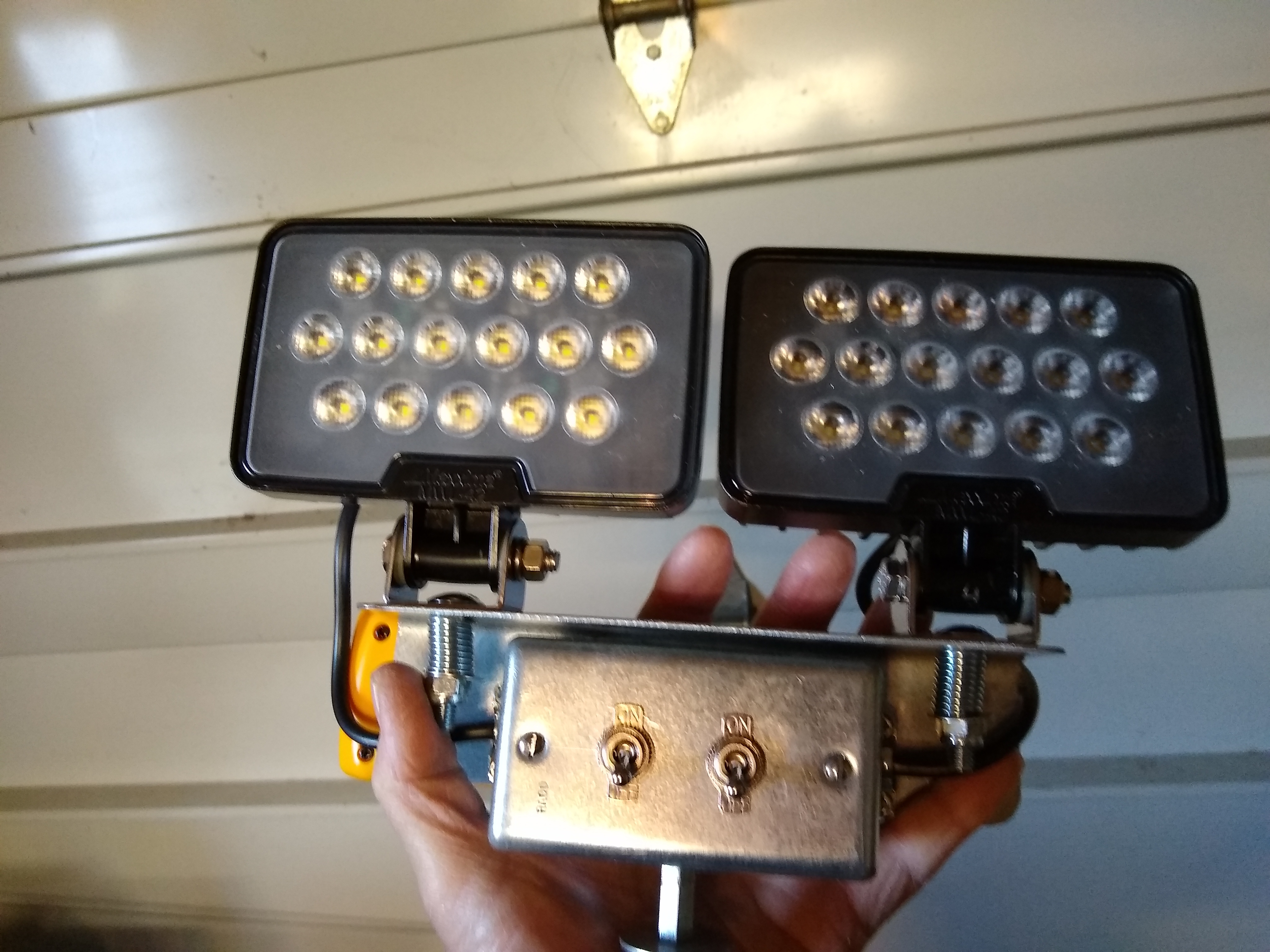 I have a few of the 20V battery adapters with wire leads that are used for different stuff. One was used to make a work light from two leftover Maxxima work lights and an old tripod (below) and another powers a yellow magnet mounted strobe light.