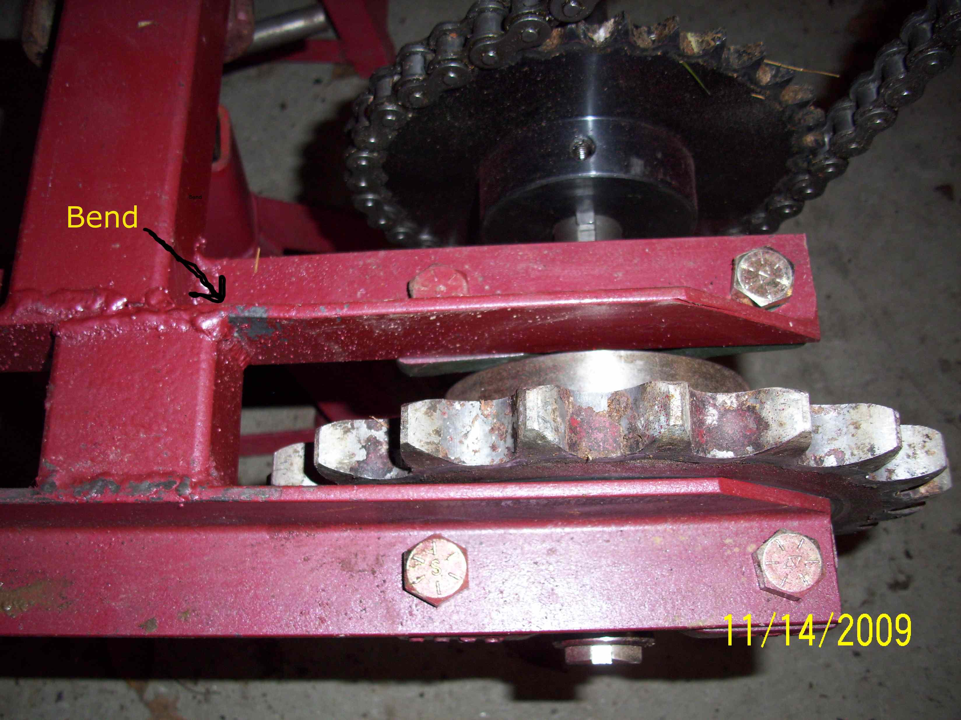 I am heading out into the garage later today to make improvements. I suspect the chain issue is a combination of multiple issues. The sectioned flexed in beginning with but then after more aggressived testing I think the frame bent but was still flexing some. With some heat and a 6ft pipe I was able to straighten the angle iron. When I first mounted the chain up everything appeared to be in line (using a small square). The photos showing the bend show everything out of alignment. The chain always came off the same way: off the lower sprocket and to the inside of the machine. This matches the out of alignment issue that are from the bend. Also the lack of additional guide rollers on the track added stress to this track sprocket and might have also contributed to the bend. The aggressive test I ran went up some pretty steep hills so this would have put most of the machines weight onto the rear sprocket along with high torqure of driving the track. Not to mention I know the machine is rear heavy from how it turns around.